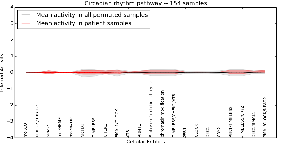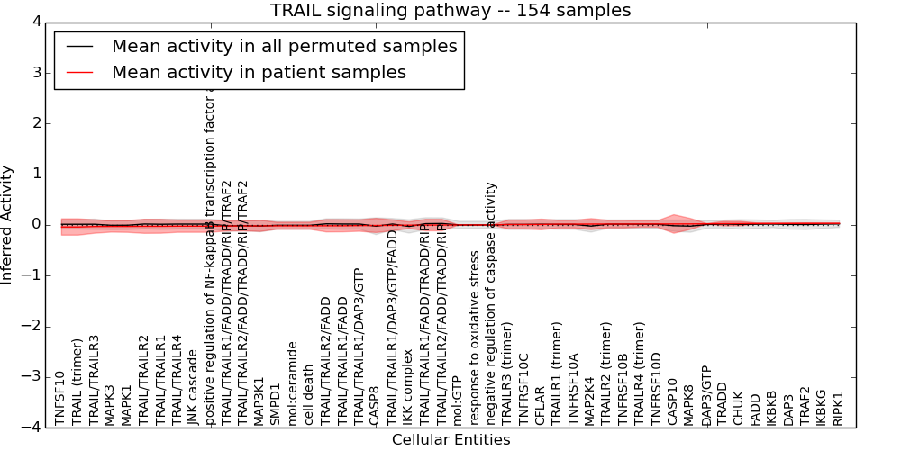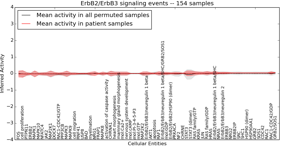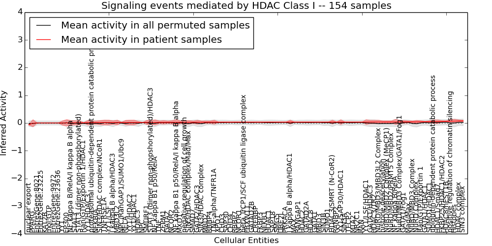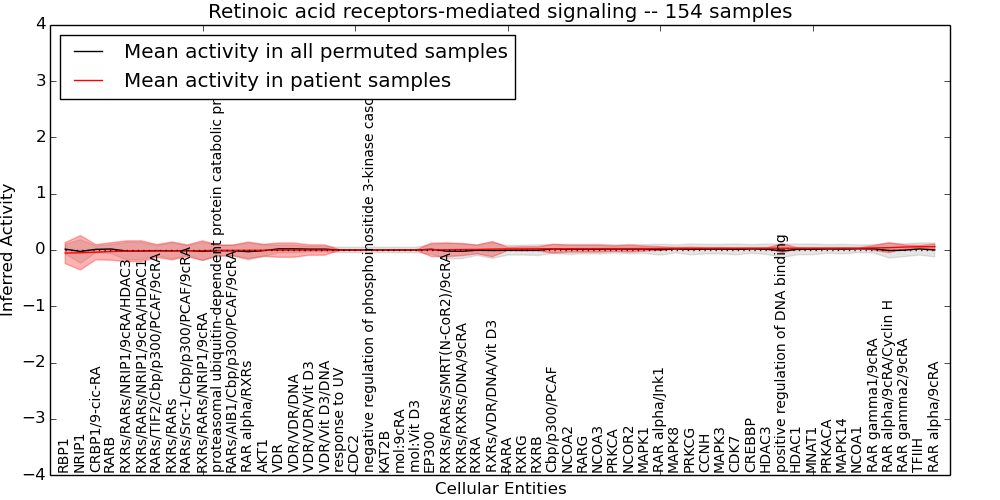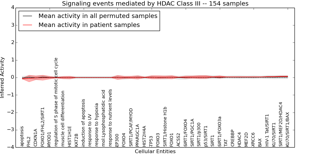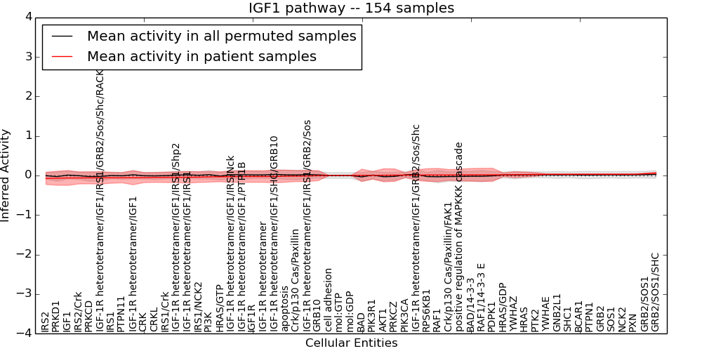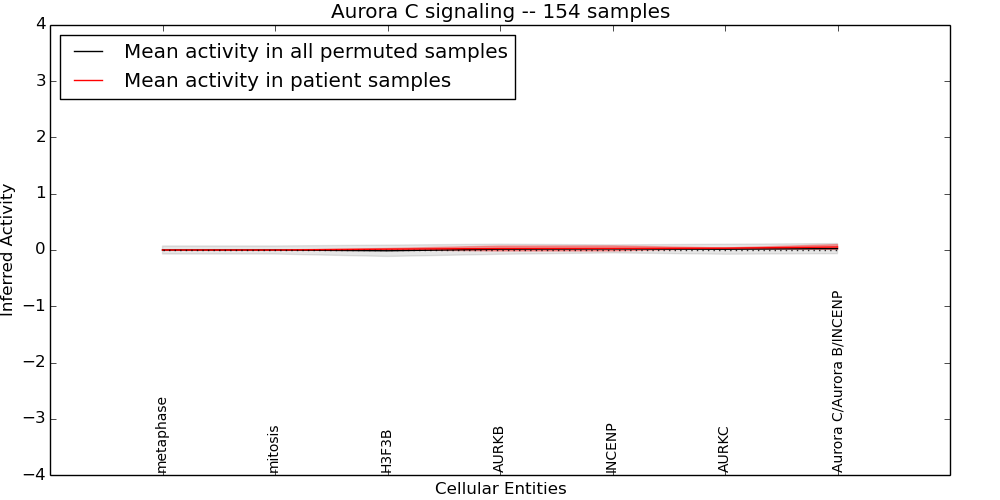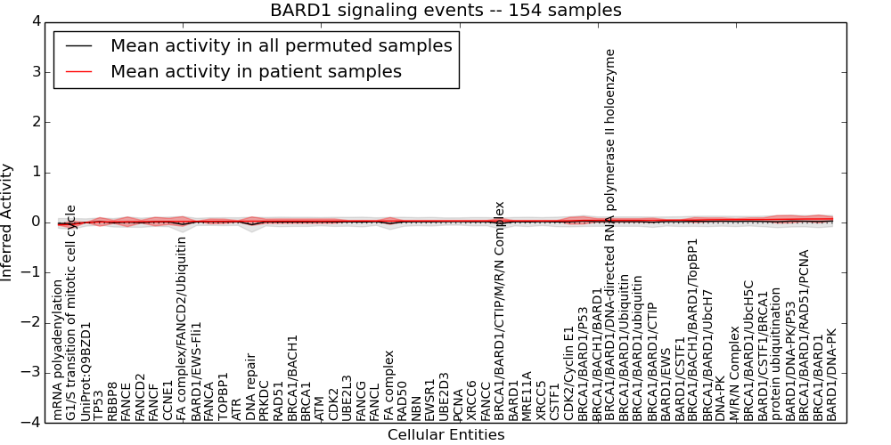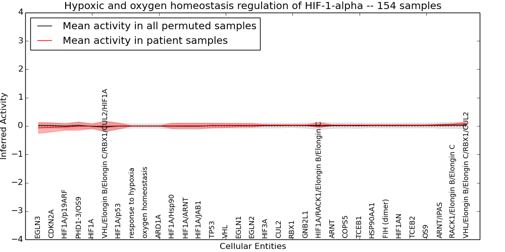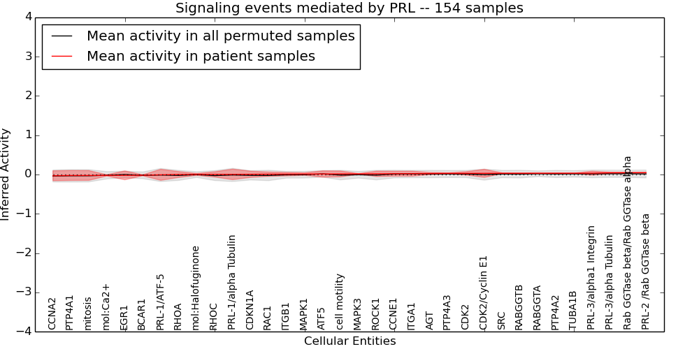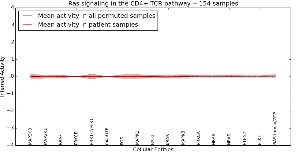 Figure S131. Get High-res Image This plot shows pathway concept perturbations across all samples against a permutation model. The concepts along the x-axis are sorted by lowest to highest mean activity for the real patient samples. Mean inferred activities are plotted along the y-axis as a colored band showing the average level and one standard deviation range. Real samples are shown in red and permuted samples in black.