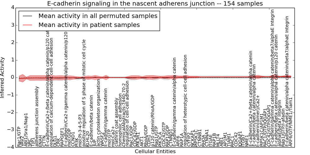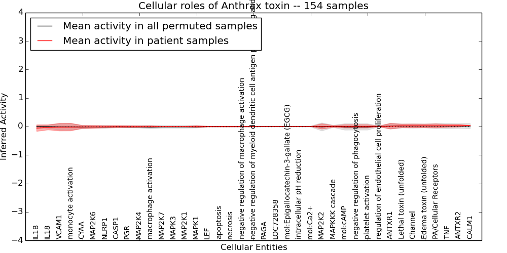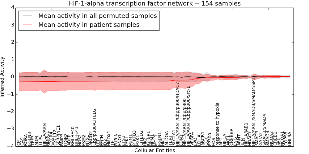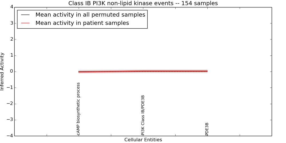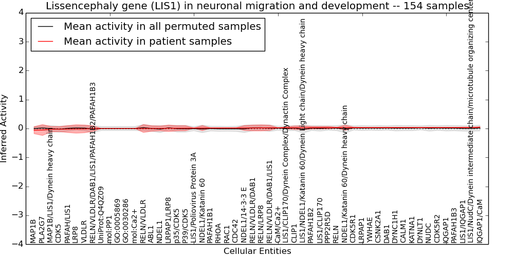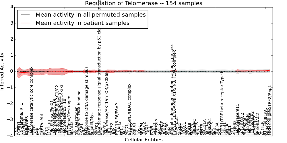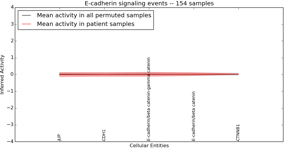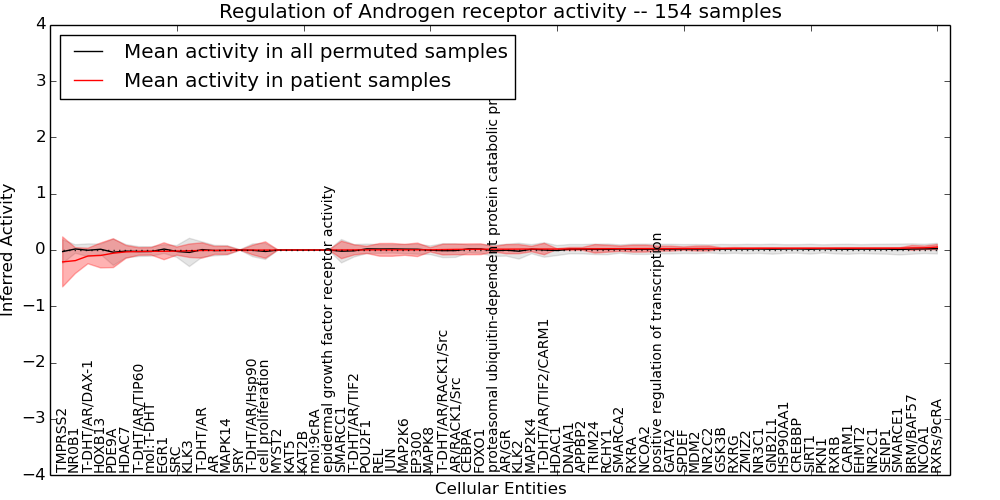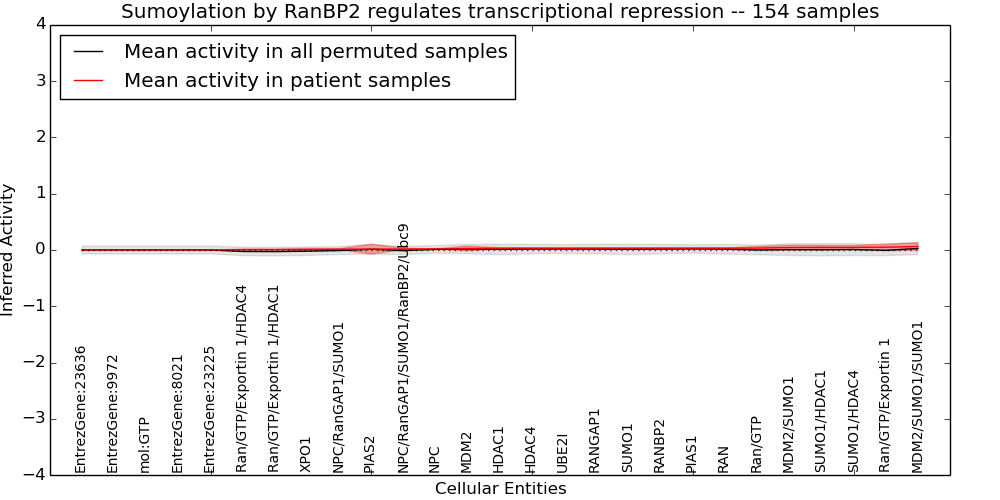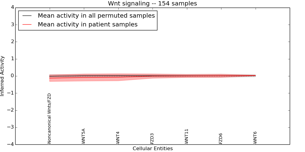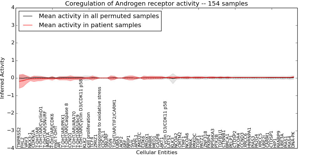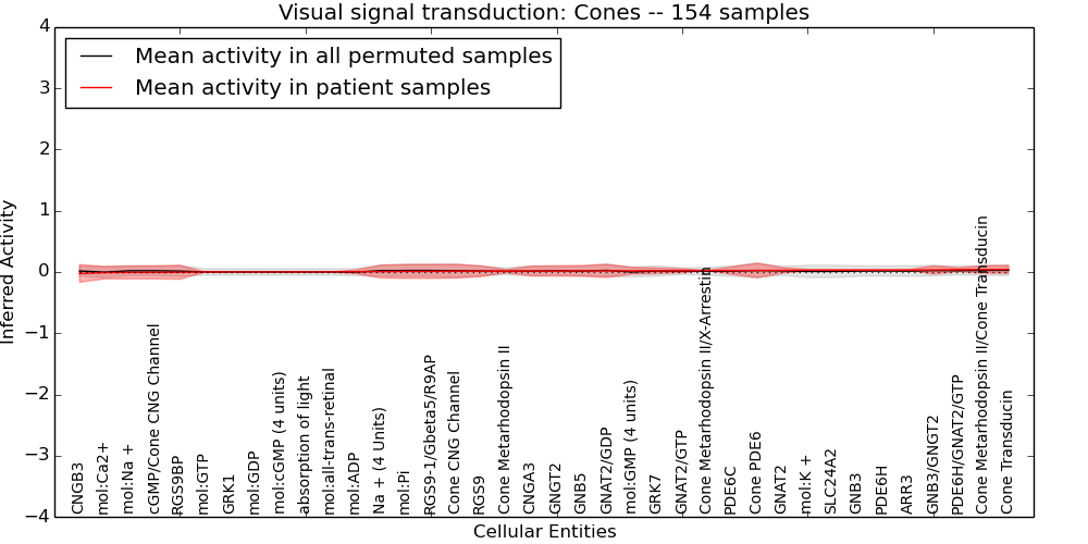 Figure S131. Get High-res Image This plot shows pathway concept perturbations across all samples against a permutation model. The concepts along the x-axis are sorted by lowest to highest mean activity for the real patient samples. Mean inferred activities are plotted along the y-axis as a colored band showing the average level and one standard deviation range. Real samples are shown in red and permuted samples in black.