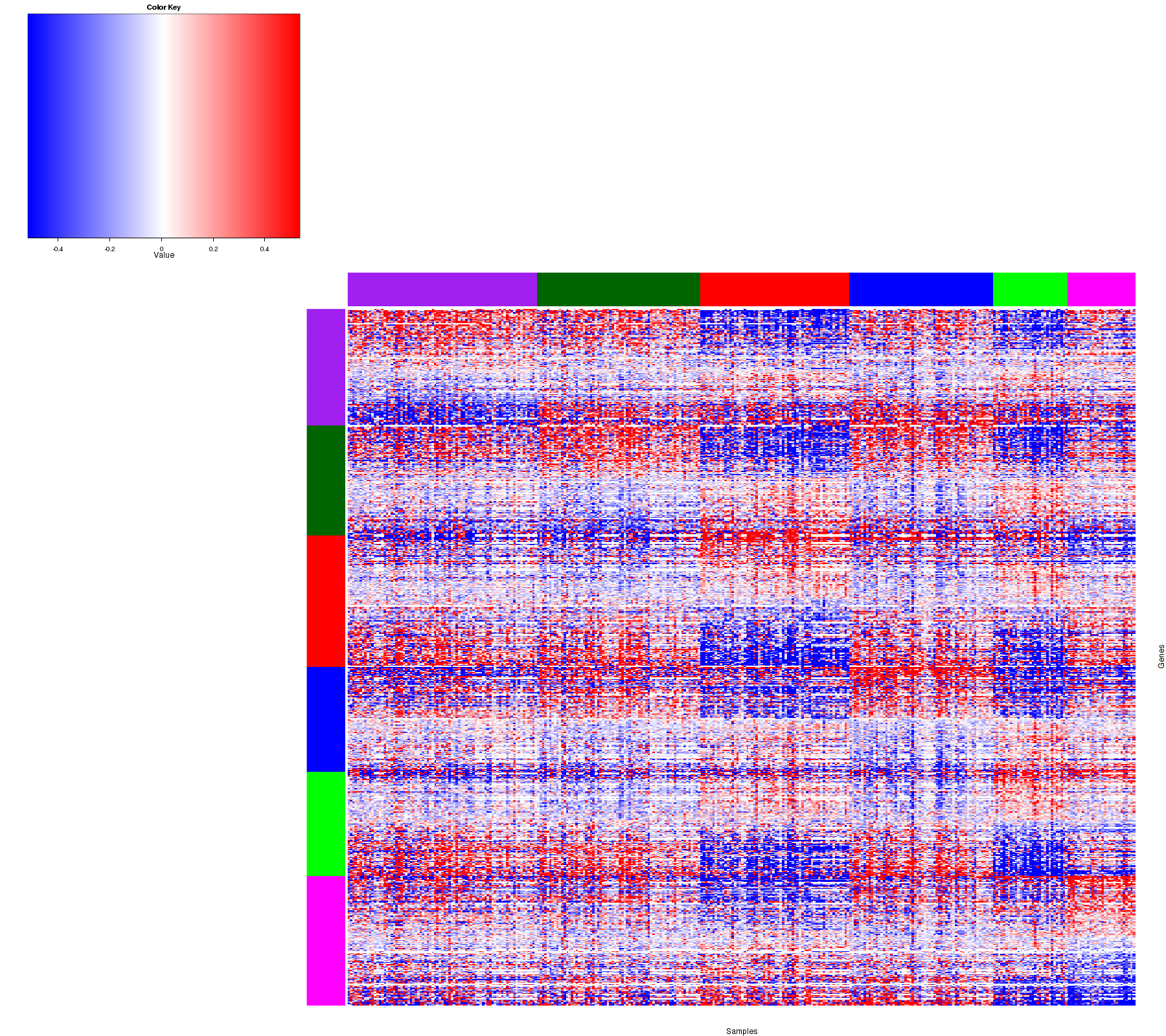 Figure 1. Get High-res Image Samples were separated into 6 clusters. Shown are 328 samples and 689 marker proteins. The color bar of the row indicates the marker proteins for the corresponding cluster.