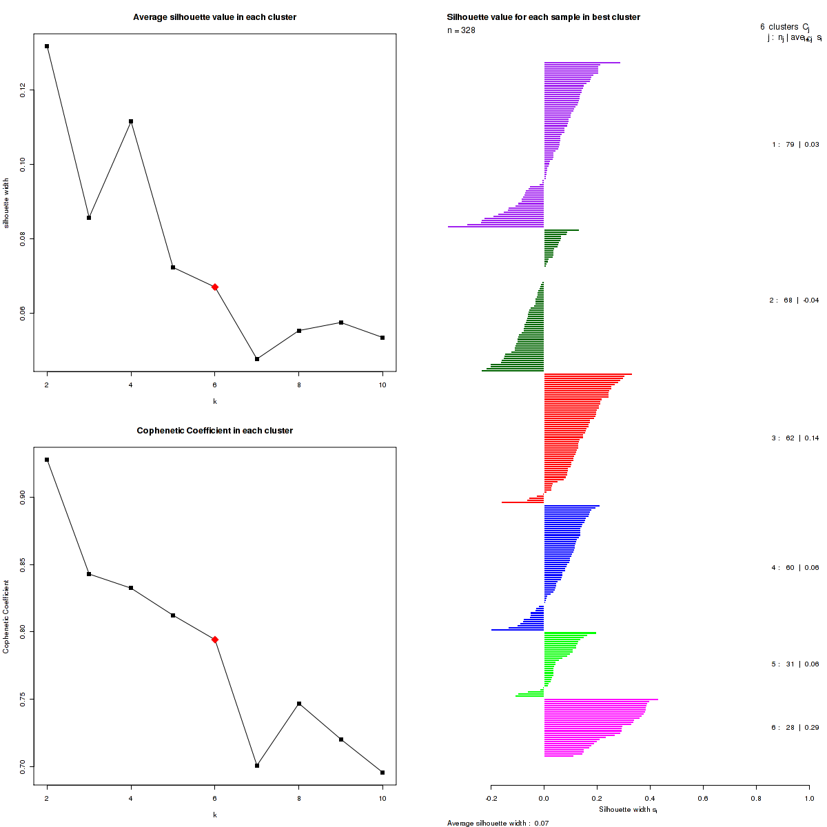 The cophenetic correlation coefficients and average silhouette values are used to determine the k with the most robust clusterings. From the plot of cophenetic correlation versus k, we select modes and the the point preceding the greatest decrease in cophenetic correlation coefficient, and from these choose the k with the highest average silhouette value.