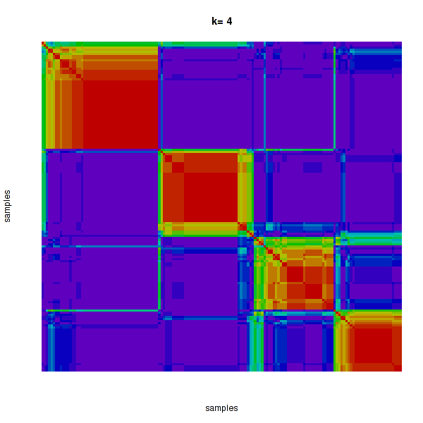 Figure 4. Get High-res Image The consensus matrix after clustering shows 4 clusters with limited overlap between clusters.