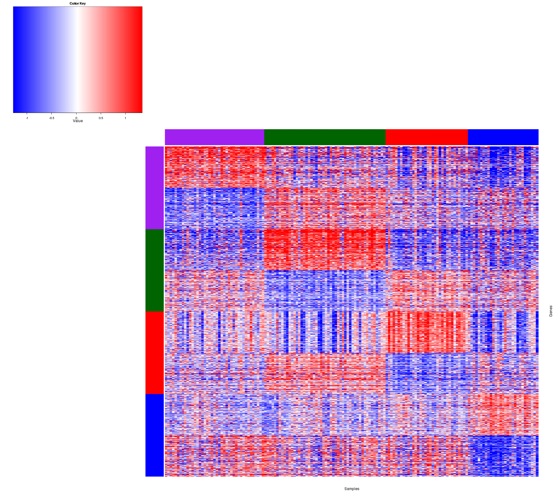 Figure 1. Get High-res Image Samples were separated into 4 clusters. Shown are 154 samples and 1200 marker genes. The color bar of the row indicates the marker genes for the corresponding cluster.