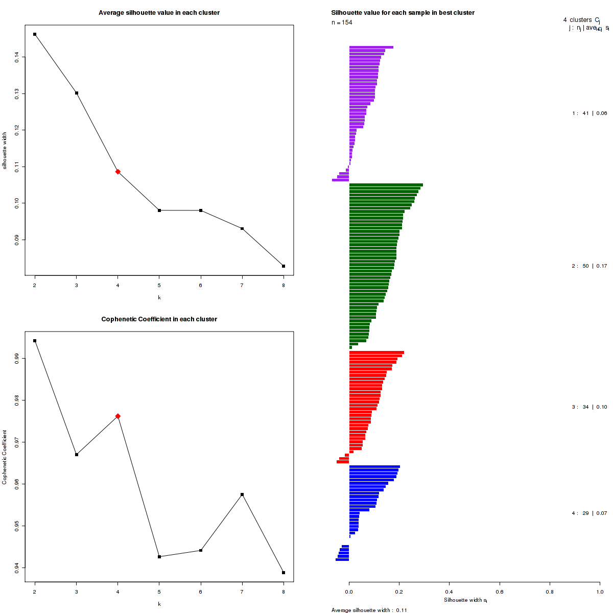The most robust consensus NMF clustering of 154 samples using the 1500 most variable genes was identified for k = 4 clusters. We computed the clustering for k = 2 to k = 10 and uused the cophenetic correlation coefficient and the average silhouette width calculation to determine the robust clusters.
