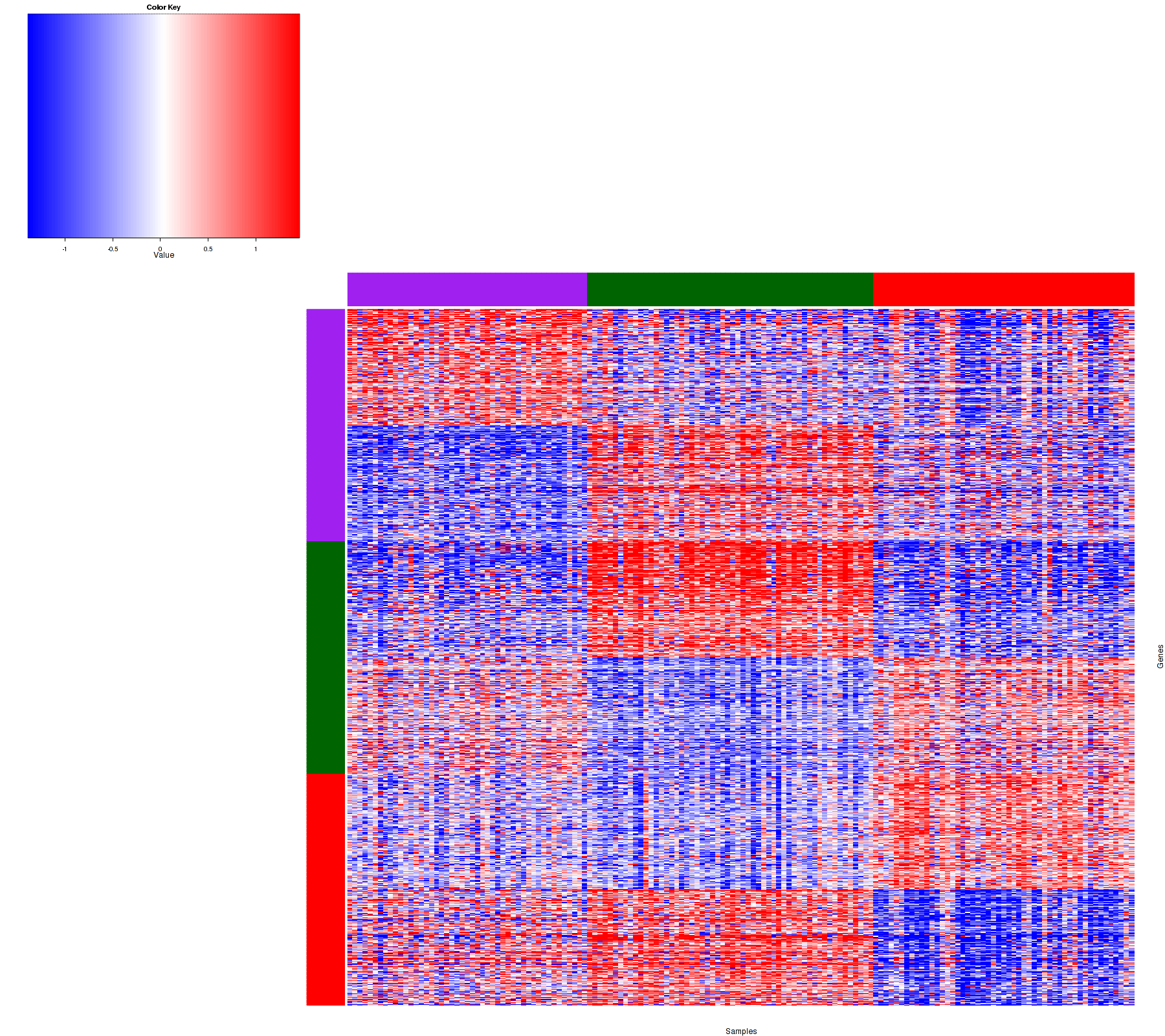Figure 1. Get High-res Image Samples were separated into 3 clusters. Shown are 154 samples and 900 marker genes. The color bar of the row indicates the marker genes for the corresponding cluster.