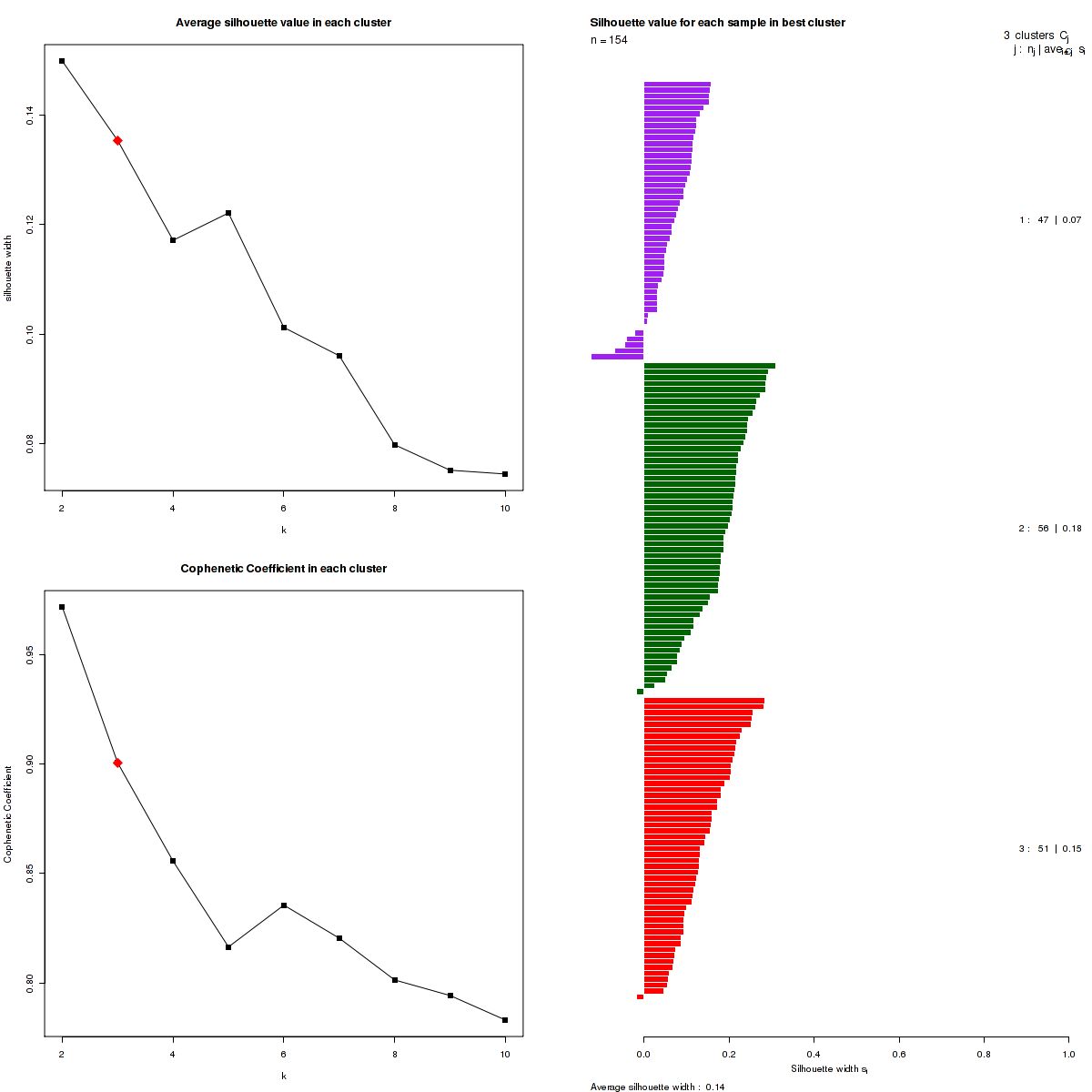 Figure 3. Get High-res Image The silhouette width was calculated for each sample and each value of k. The left upper panel shows the average silhouette width across all samples for each tested k (left upper panel). The left lower panel shows the Cophenetic Correlation Coefficients for each tested k. The right panel shows assignments of clusters to samples and the k silhouette width of each sample for the most robust clustering.