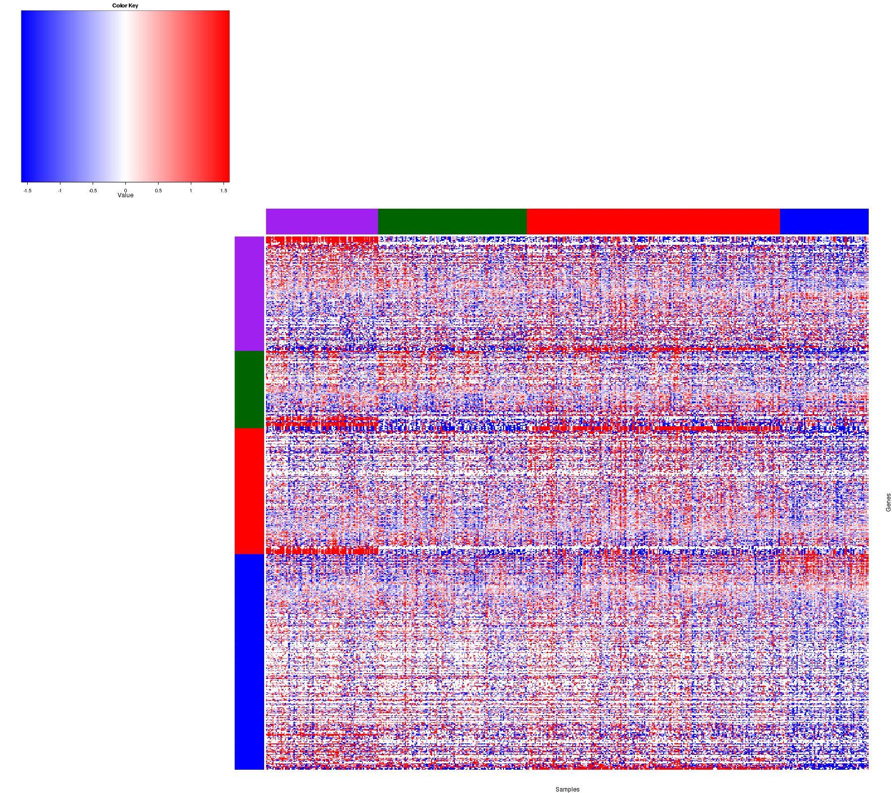 Figure 1. Get High-res Image Samples were separated into 4 clusters. Shown are 478 samples and 732 marker miRs. The color bar of the row indicates the marker miRs for the corresponding cluster.