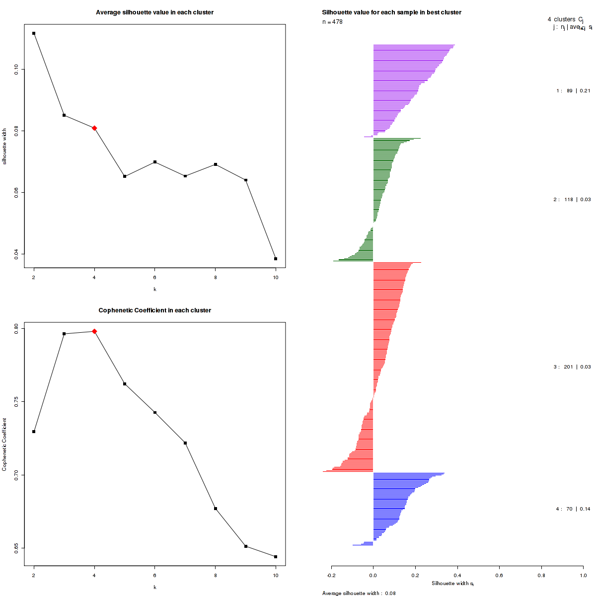 The cophenetic correlation coefficients and average silhouette values are used to determine the k with the most robust clusterings. From the plot of cophenetic correlation versus k, we select modes and the the point preceding the greatest decrease in cophenetic correlation coefficient, and from these choose the k with the highest average silhouette value.