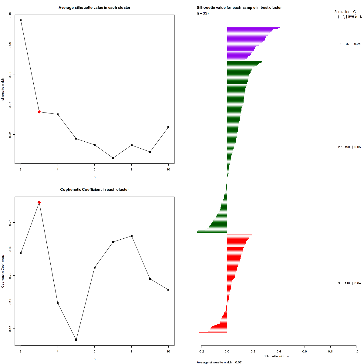 Figure 3. Get High-res Image The silhouette width was calculated for each sample and each value of k. The left upper panel shows the average silhouette width across all samples for each tested k (left upper panel). The left lower panel shows the Cophenetic Correlation Coefficients for each tested k. The right panel shows assignments of clusters to samples and the k silhouette width of each sample for the most robust clustering.