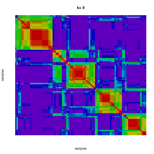 Figure 4. Get High-res Image The consensus matrix after clustering shows 5 clusters with limited overlap between clusters.