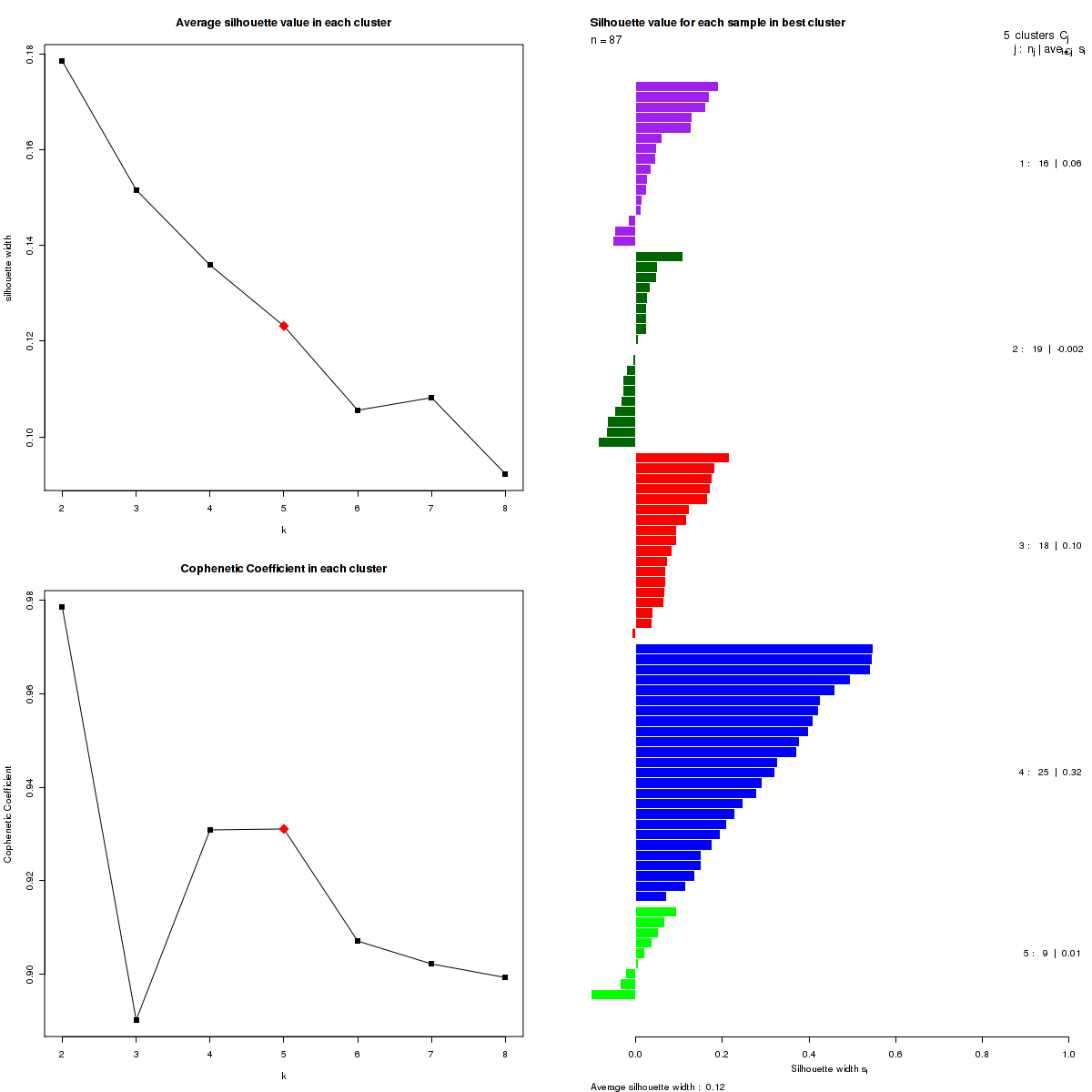 Figure 3. Get High-res Image The silhouette width was calculated for each sample and each value of k. The left upper panel shows the average silhouette width across all samples for each tested k (left upper panel). The left lower panel shows the Cophenetic Correlation Coefficients for each tested k. The right panel shows assignments of clusters to samples and the silhouette width of each sample for the most robust clustering.