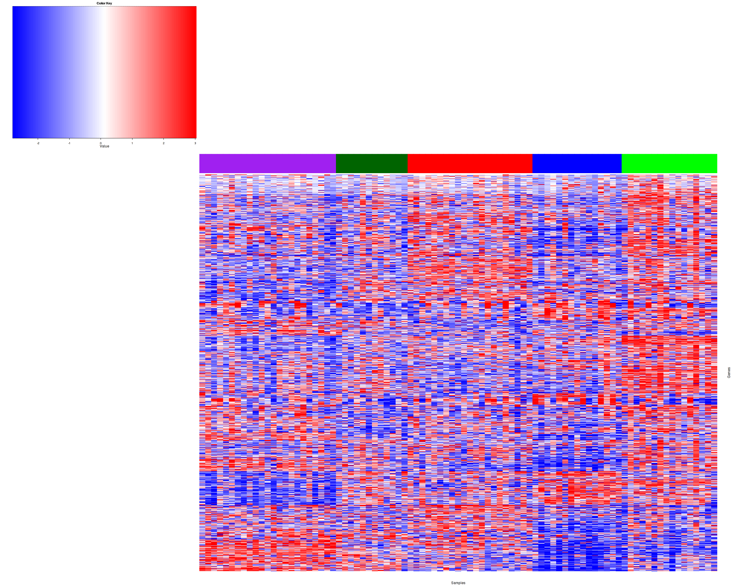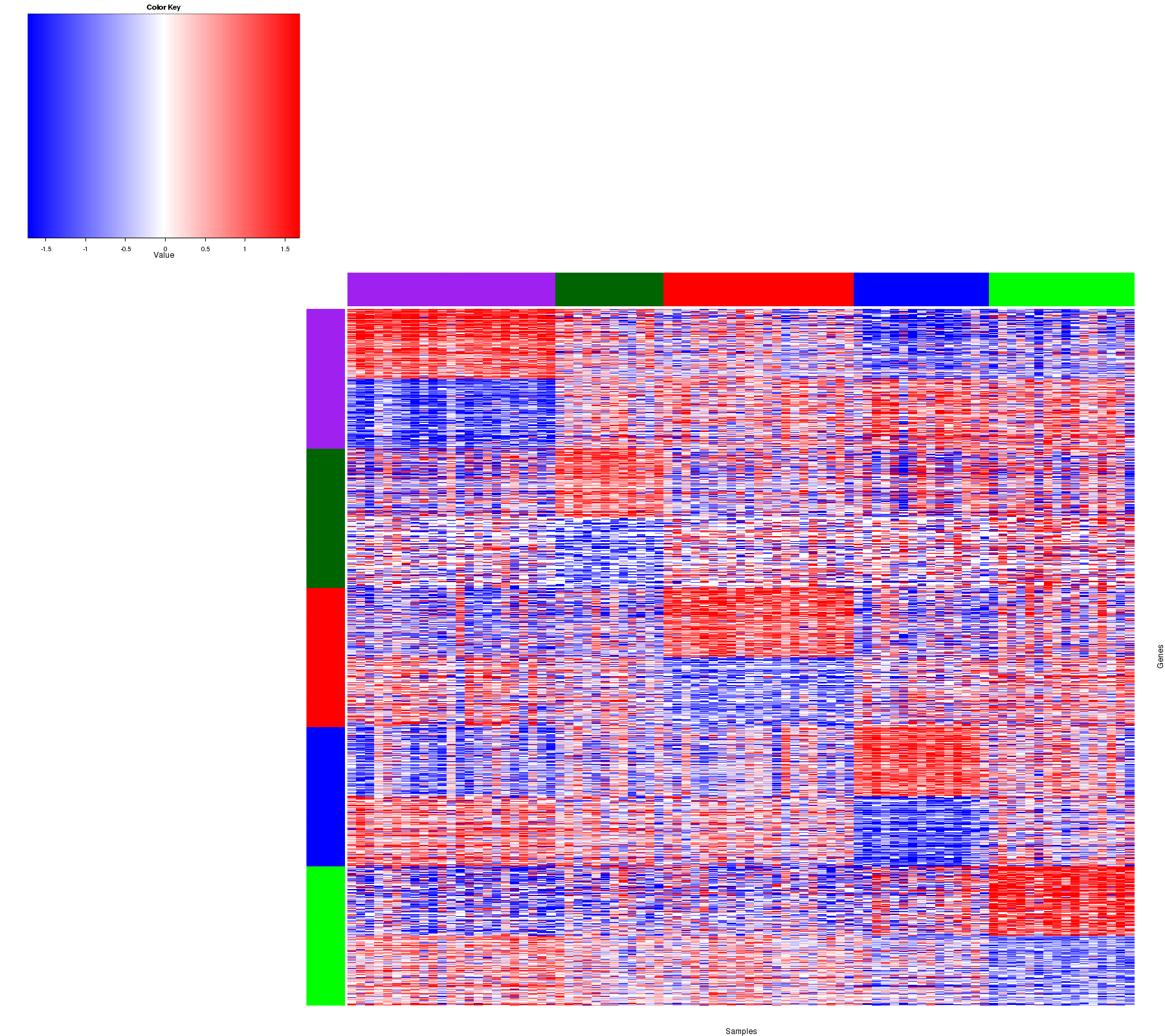 Figure 1. Get High-res Image Samples were separated into 5 clusters. Shown are 87 samples and 1500 marker genes. The color bar of the row indicates the marker genes for the corresponding cluster.