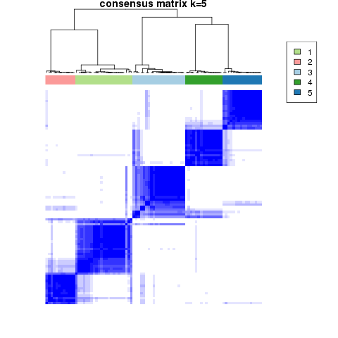 Figure 4. Get High-res Image The consensus matrix after clustering shows 5 clusters with limited overlap between clusters.
