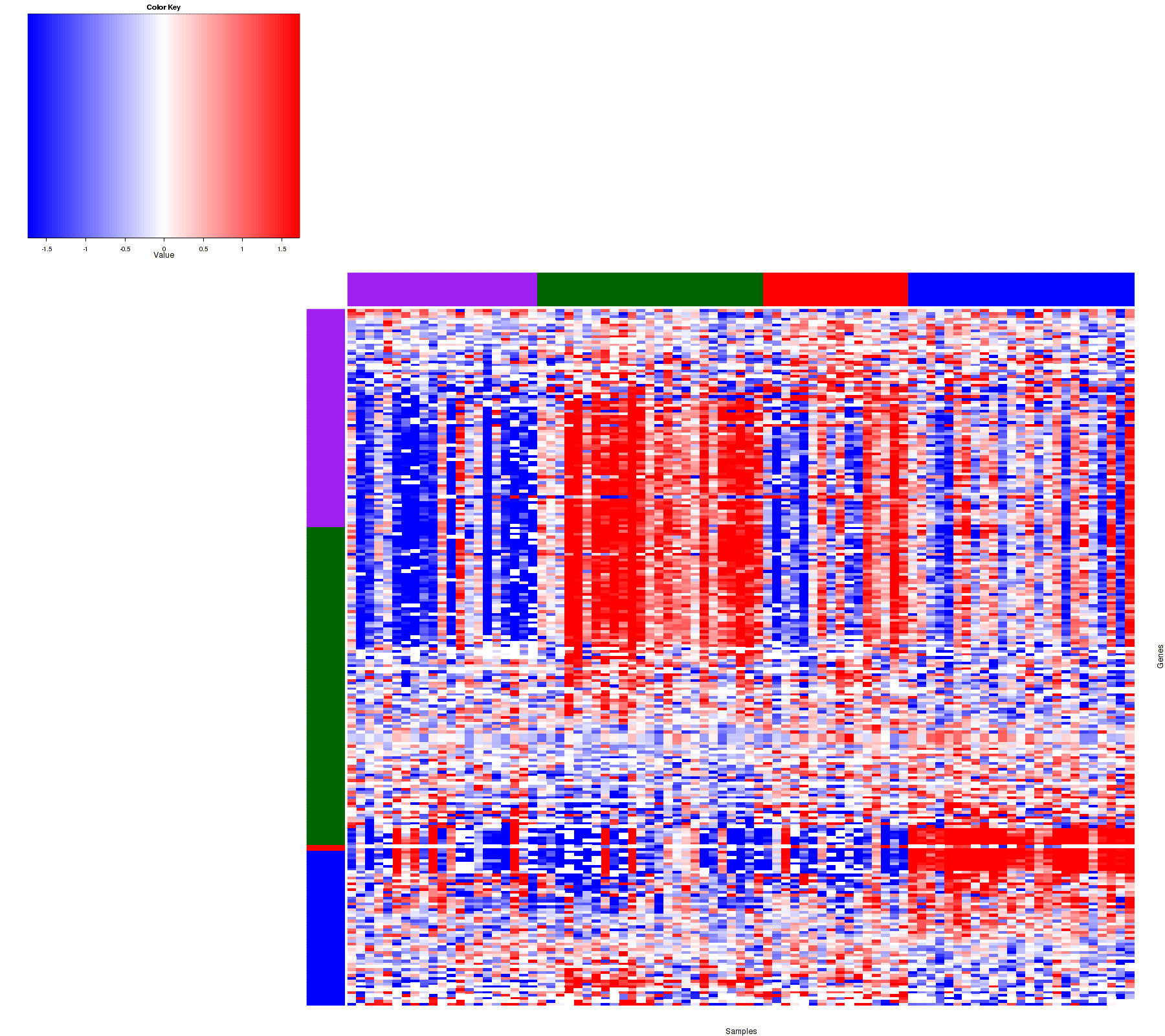 Figure 1. Get High-res Image Samples were separated into 4 clusters. Shown are 87 samples and 243 marker miRs. The color bar of the row indicates the marker miRs for the corresponding cluster.