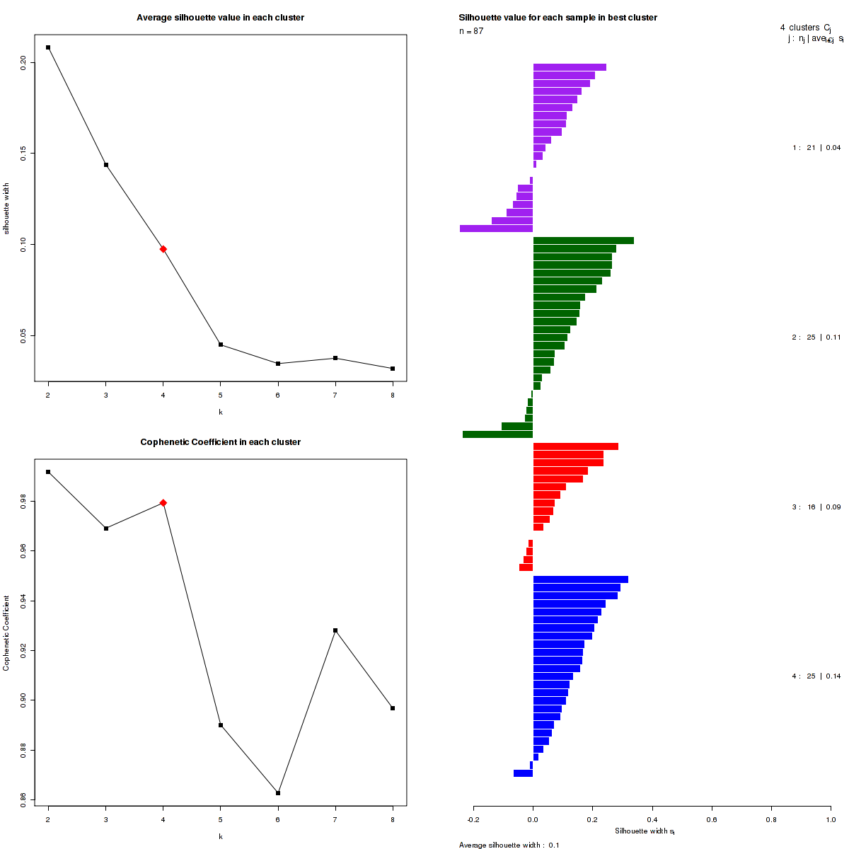 Figure 3. Get High-res Image The silhouette width was calculated for each sample and each value of k. The left upper panel shows the average silhouette width across all samples for each tested k (left upper panel). The left lower panel shows the Cophenetic Correlation Coefficients for each tested k. The right panel shows assignments of clusters to samples and the silhouette width of each sample for the most robust clustering.