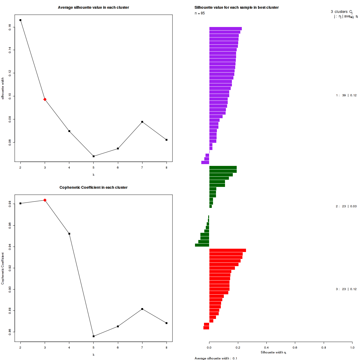 Figure 3. Get High-res Image The silhouette width was calculated for each sample and each value of k. The left upper panel shows the average silhouette width across all samples for each tested k (left upper panel). The left lower panel shows the Cophenetic Correlation Coefficients for each tested k. The right panel shows assignments of clusters to samples and the silhouette width of each sample for the most robust clustering.