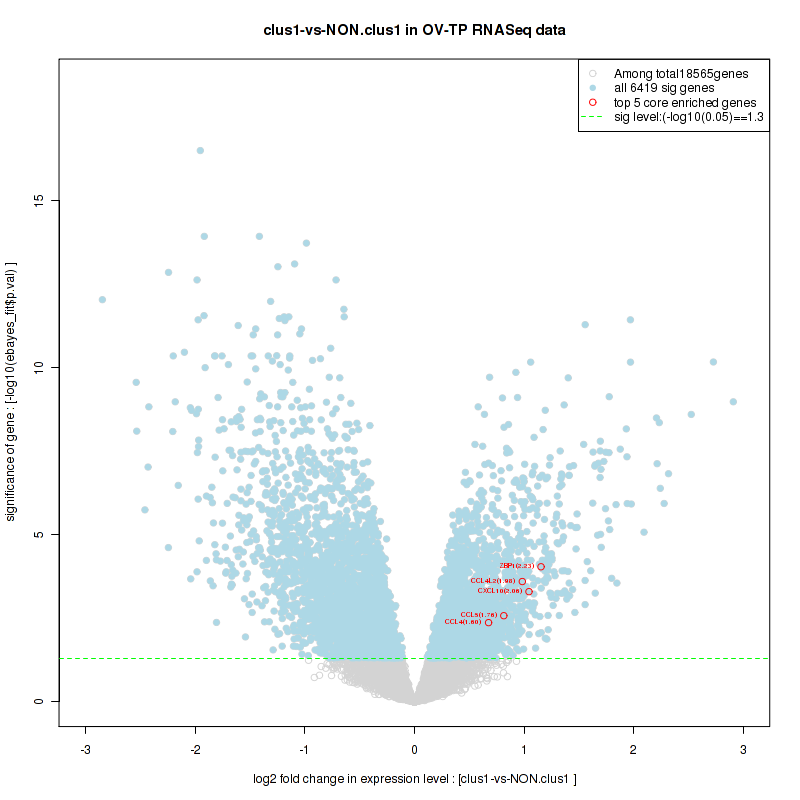 Figure S56. Get High-res Image For the top 5 core enriched genes in the pathway: KEGG CHEMOKINE SIGNALING PATHWAY, this volcano plot shows how much they are up/down-regulated and significant. The significance was calculated by empirical bayesian fit