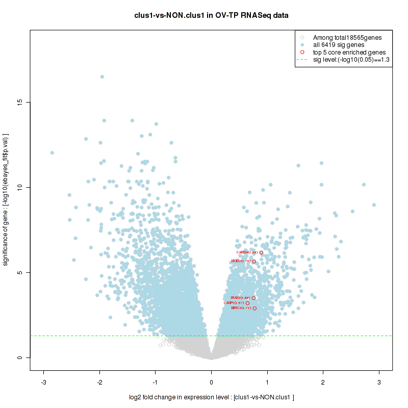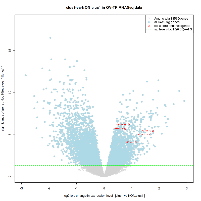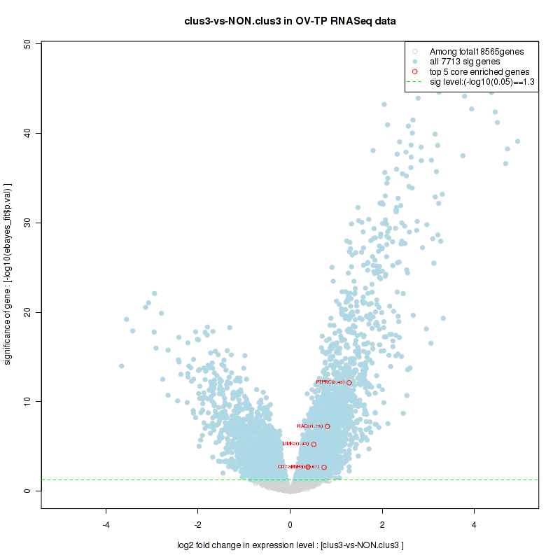 Figure S58. Get High-res Image For the top 5 core enriched genes in the pathway: KEGG PHOSPHATIDYLINOSITOL SIGNALING SYSTEM, this volcano plot shows how much they are up/down-regulated and significant. The significance was calculated by empirical bayesian fit