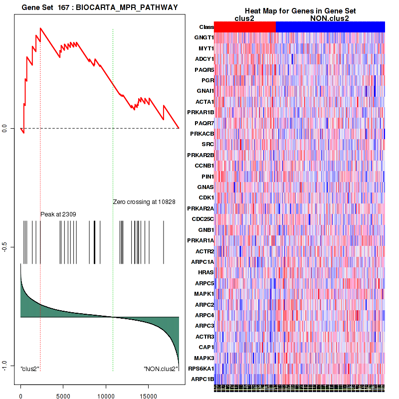 Table S1. Get Full Table This table shows a Running Enrichment Score (RES) of each gene in this pathway, that is, the enrichment score at this point in the ranked list of genes. All genes are ranked by Signal-to-Noise (S2N), a measure of similarity as default and are used to obtain ES matrix of all genes. In this way, GSEA tool uses expression pattern of not only overlapped genes but also not-overlapped genes to produce ES matrix.