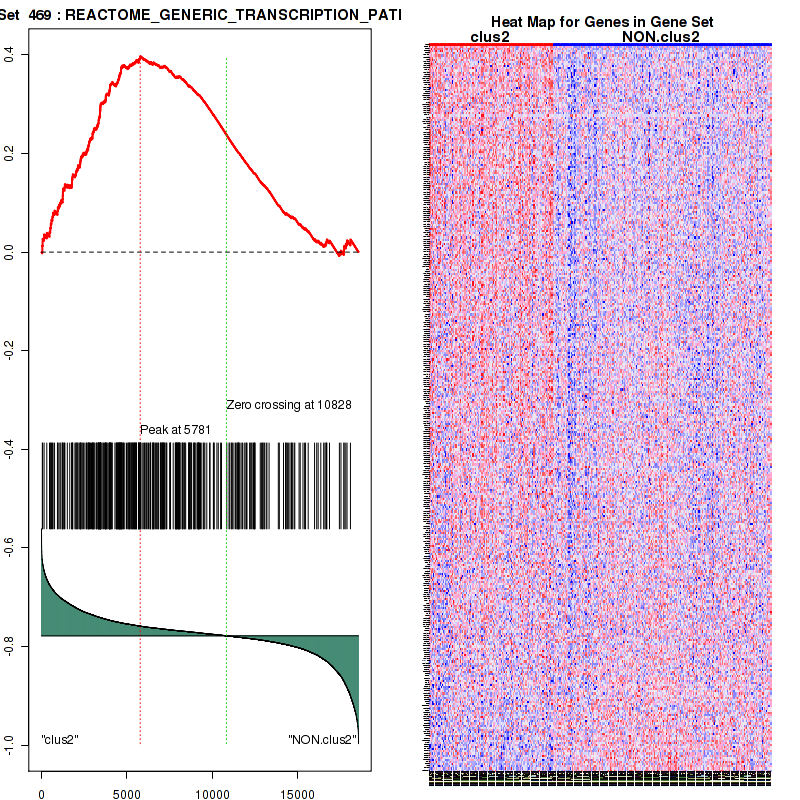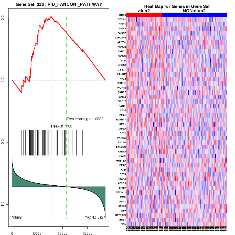Table 3. Get Full Table This table shows top 10 pathways which are significantly enriched in cluster clus1. It displays only significant gene sets satisfying nom.p.val.threshold (-1), fwer.p.val.threshold (-1) , fdr.q.val.threshold (0.25) and the default table is sorted by Normalized Enrichment Score (NES). Further details on NES statistics, please visit The Broad GSEA website.