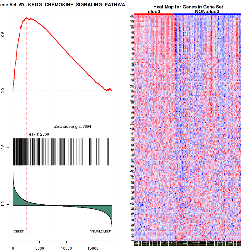 Figure S55. Get High-res Image This plot shows mRNAseq_cNMF expression data heatmap (on the left) a RunningEnrichmentScore(RES) plot (on the top right) and a Signal2Noise(S2N) plot (on the bottom right) of genes in the pathway: KEGG CHEMOKINE SIGNALING PATHWAY.