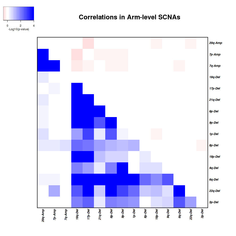 Figure 1. Get High-res Image Co-occurring and mutually-exclusive pairs for copy number variations of arm level events. Blue means two events are co-occurring and red means two events are mutually-exclusive.