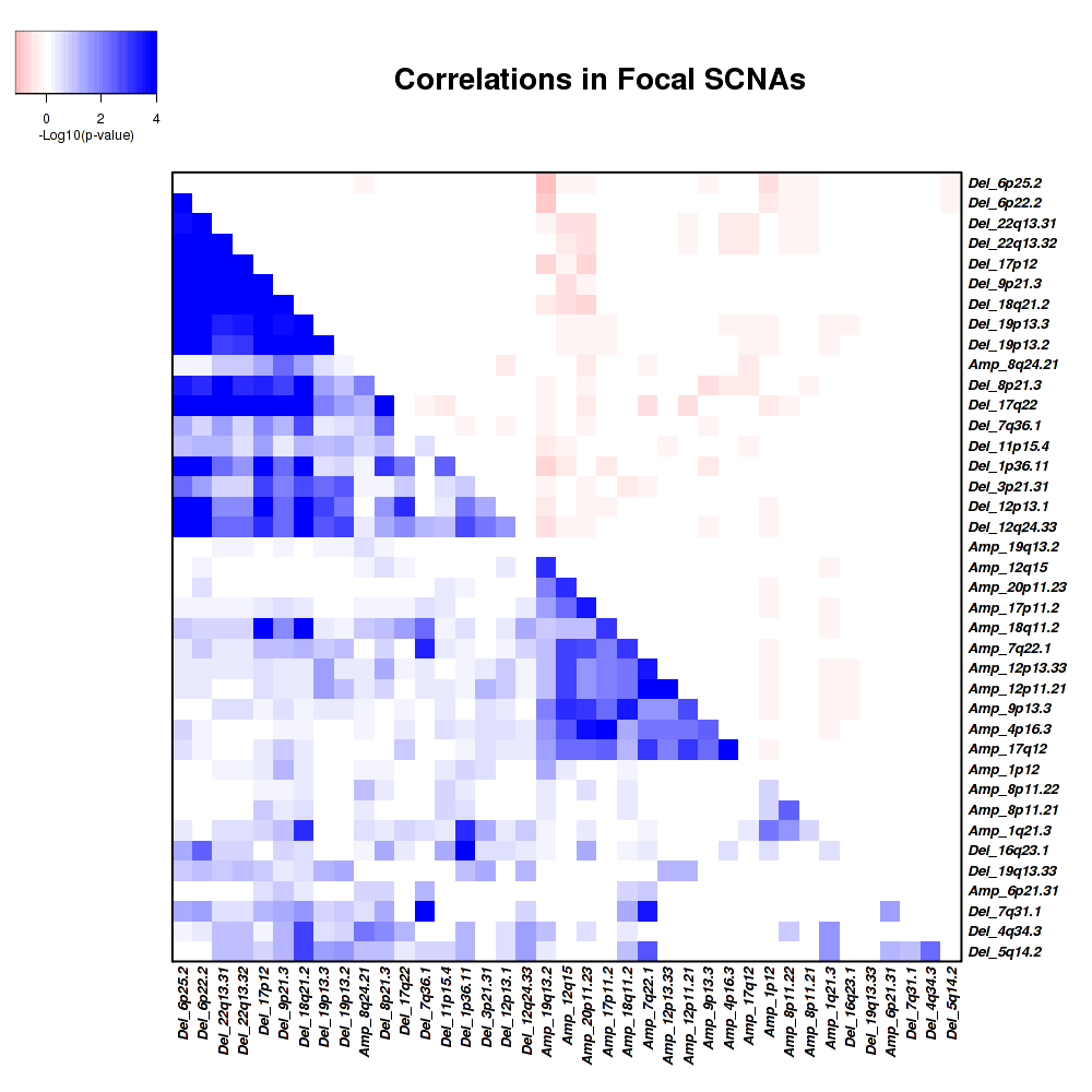 Figure 2. Get High-res Image Co-occurring and mutually-exclusive pairs for copy number variations of focal events. Blue means two events are co-occurring and red means two events are mutually-exclusive.