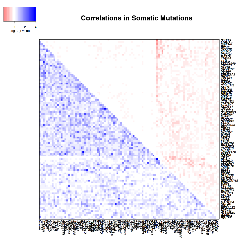 Figure 3. Get High-res Image Co-occurring and mutually-exclusive pairs for significantly mutated genes. Blue means two events are co-occurring and red means two events are mutually-exclusive.