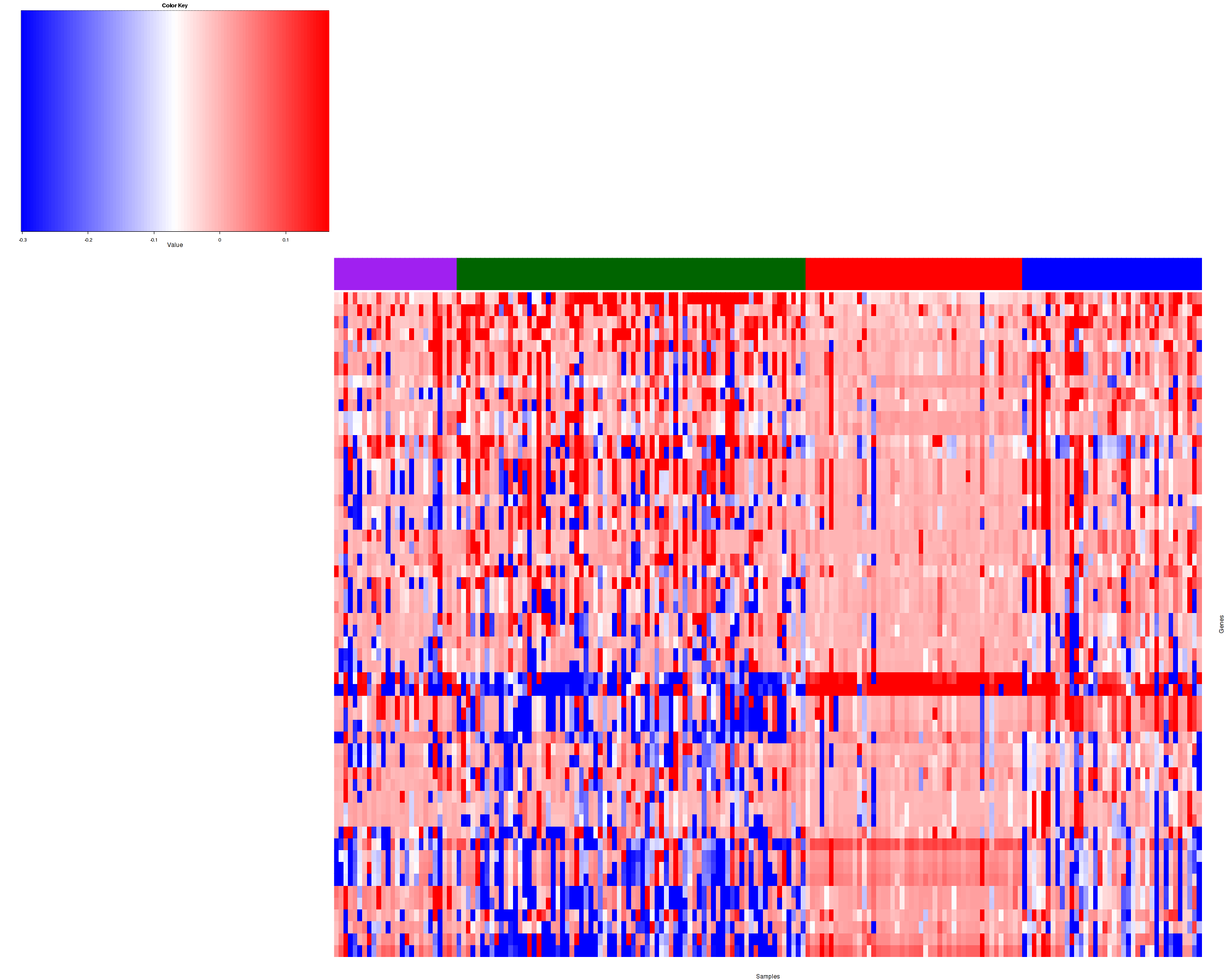 Figure 1. Get High-res Image Samples were separated into 4 clusters. Shown are 184 samples and 52 marker focal events. The color bar of the row indicates the marker focal events for the corresponding cluster.