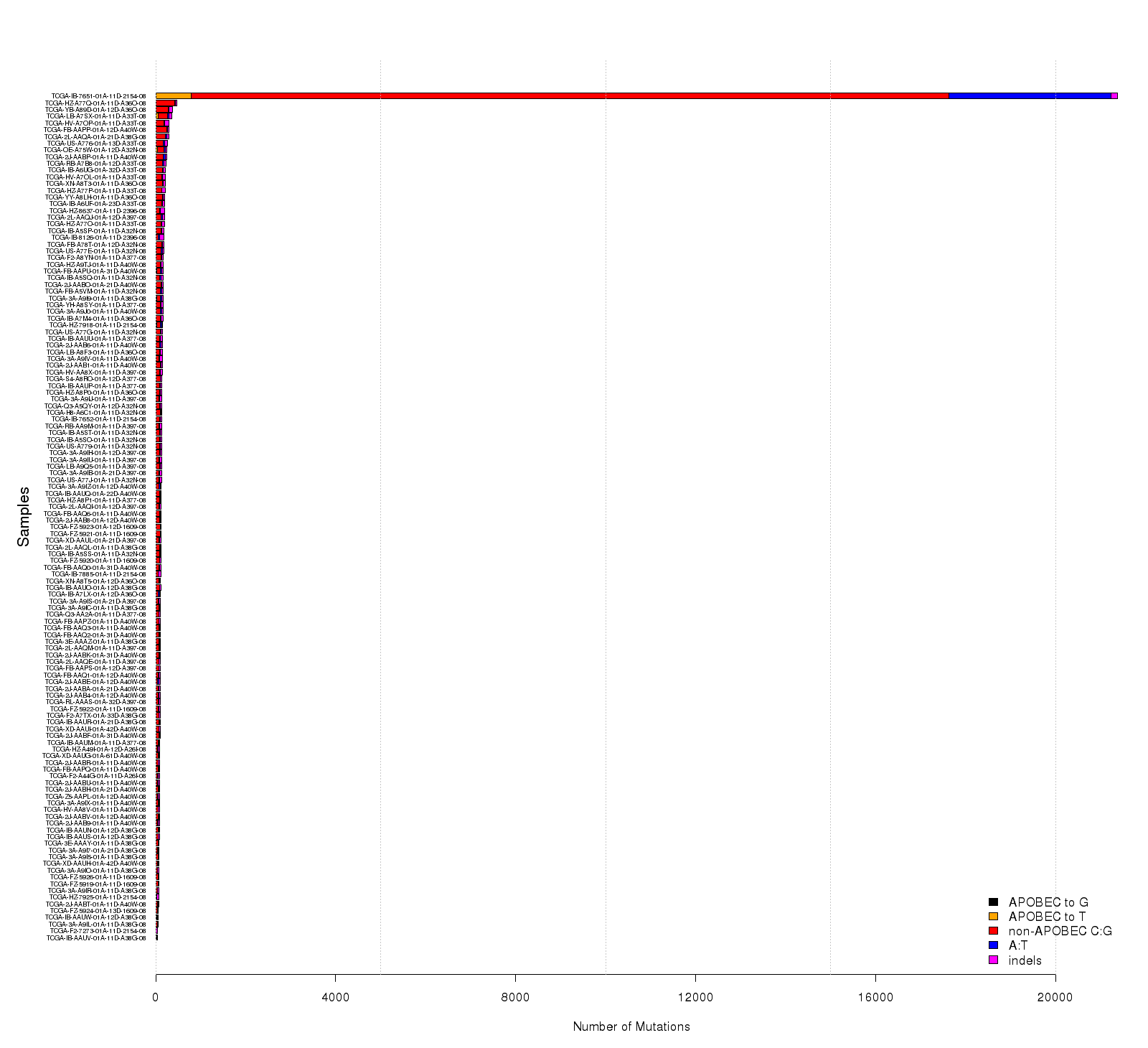 Figure 4. Get High-res Image Numbers of APOBEC and non-APOBEC mutations (X-axis) in each sample (Y-axis). All values are calculated based on the values in the columns “indels”, “substitutions”, and columns containing individual substitution types in the “*_sorted_sum_all_fisher_Pcorr.txt” file. “APOBEC to G” – number of tCw→tGw mutations; “APOBEC to T” – number of tCw→tTw mutations; “non-APOBEC C:G” – number of mutations in C:G base pairs not conforming to the APOBEC signature (= total of tCw→tAw plus all mutations in C not occurring in the tCw motif); “A:T” –- all mutations in A:T base pairs; “indels” – all indels. All counts include complementary mutations. Samples are ordered by total mutation counts in the descending order. Since only base substitutions are shown, bars with excessive numbers of non-substitution mutations may be shorter than the two flanking bars.