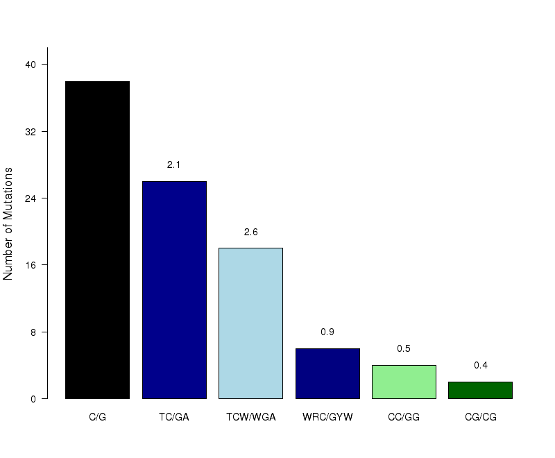 Figure 7. Get High-res Image The number of mutations within C- or G-coordinated clusters occurring in different known C- or G-specific mutation motifs. Counts are totaled among all samples. “C/G” – any mutation in C:G base pairs; “TC/GA” – any mutation in a less stringent APOBEC motif: tC (mutated nucleotide capitalized); “TCW/WGA” – any mutation in the stringent APOBEC motif: tCw; “WRC/GYW” – any mutation in the wrC motif for AID cytidine deaminase (r=A or G; y=C or T); “CC/GG” – any mutation in the cC motif for APOBEC3G; “CG/CG” – any mutation in the Cg (or CpG) motif frequently methylated (5me-C) and prone to deamination. Fold enrichments are calculated using values from the corresponding columns (including complementary mutations) in the “Totals” row of the “*_sorted_sum_G_C_clusters.txt” file. Fold enrichments for each signature (shown as numbers above the bars) are calculated the same as the fold enrichment for the APOBEC mutation motif. All three possible substitutions of C are included (i.e. to A, T and G). When tCw-specific APOBECs are the source of clustered mutations, both tC and tCw should be enriched with the latter being greater. Moreover, other C-specific mutation signatures should be depleted.
