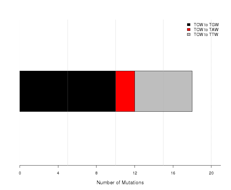 Figure 8. Get High-res Image The number of mutations categorized into three possible types of substitutions at the tCw motif (complementary mutations included) within C- or G-coordinated clusters. Numbers are calculated using the “Totals” row in the corresponding columns of the “*_sorted_sum_G_C_clusters.txt” file. Mutations caused by cytidine deamination in stretches of ssDNA caused by APOBEC mutagenesis are expected to be predominantly C-->T or C-->G with very few C-->A. Base substitution categories are shown within TCW context.