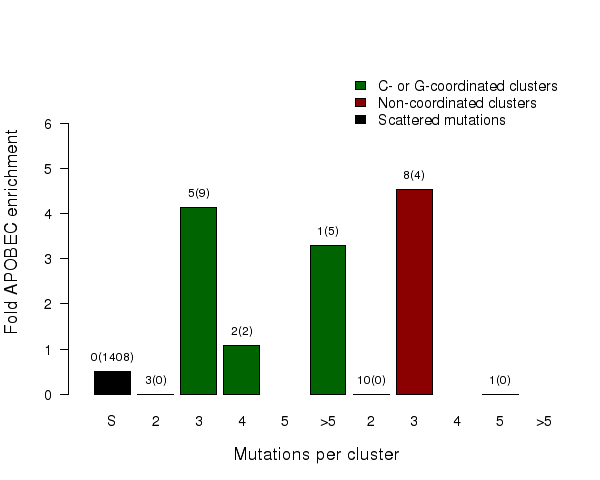 Fold enrichment of the APOBEC mutation signature in clusters of different sizes of two categories – C- or G-coordinated or non-coordinated as well as in non-clustered (scattered) mutations. Smaller clusters usually show less enrichment because they have a higher chance to be formed by random mutations that occurred in close vicinity to each other. Values above the bars display the total number of mutation clusters in each class and in parentheses the total numbers of APOBEC signature mutations in a category. Values for fold enrichment as well as mutation and mutation cluster counts are taken from the following output files which can be downloaded from firehose_get (https://confluence.broadinstitute.org/display/GDAC/Download):