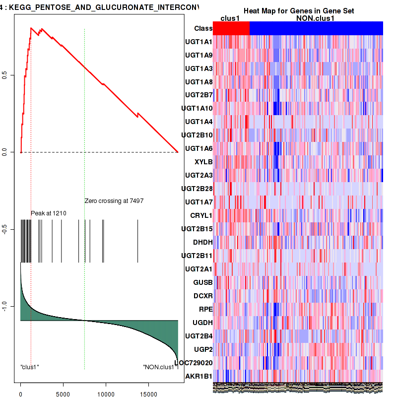 Figure S1. Get High-res Image This plot shows mRNAseq_cNMF expression data heatmap (on the left) a RunningEnrichmentScore(RES) plot (on the top right) and a Signal2Noise(S2N) plot (on the bottom right) of genes in the pathway: KEGG PENTOSE AND GLUCURONATE INTERCONVERSIONS.