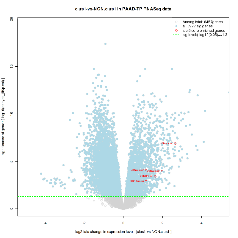 Figure S2. Get High-res Image For the top 5 core enriched genes in the pathway: KEGG PENTOSE AND GLUCURONATE INTERCONVERSIONS, this volcano plot shows how much they are up/down-regulated and significant. The significance was calculated by empirical bayesian fit