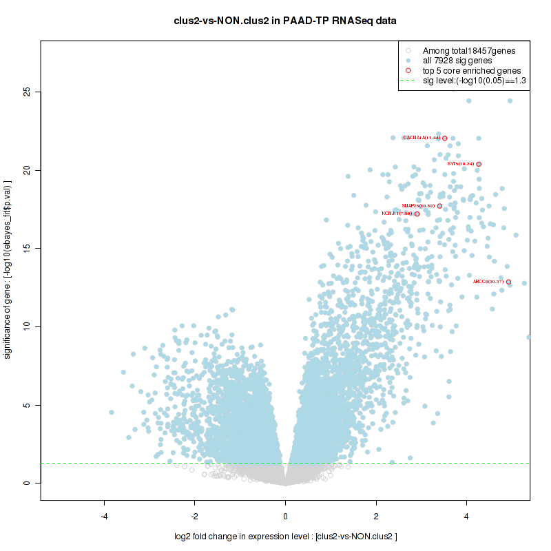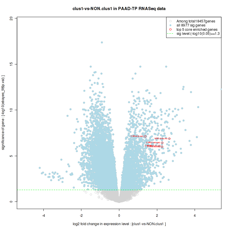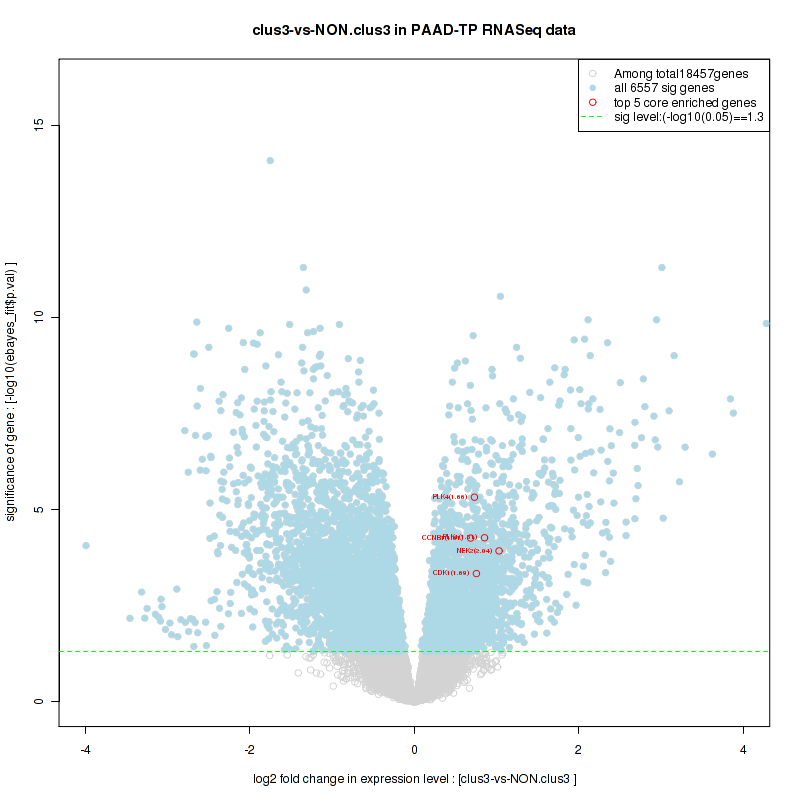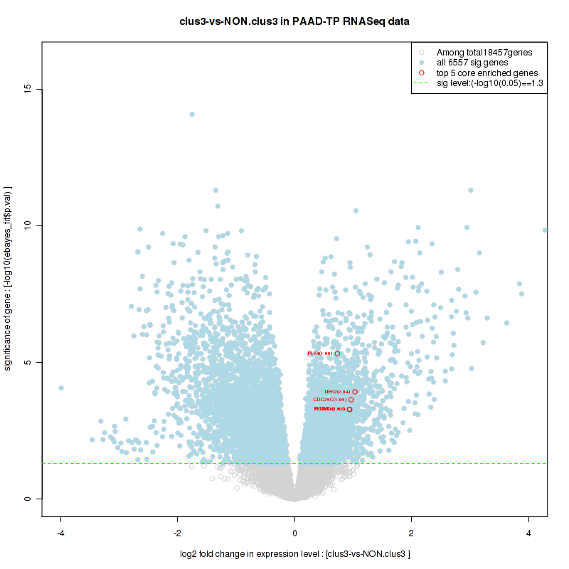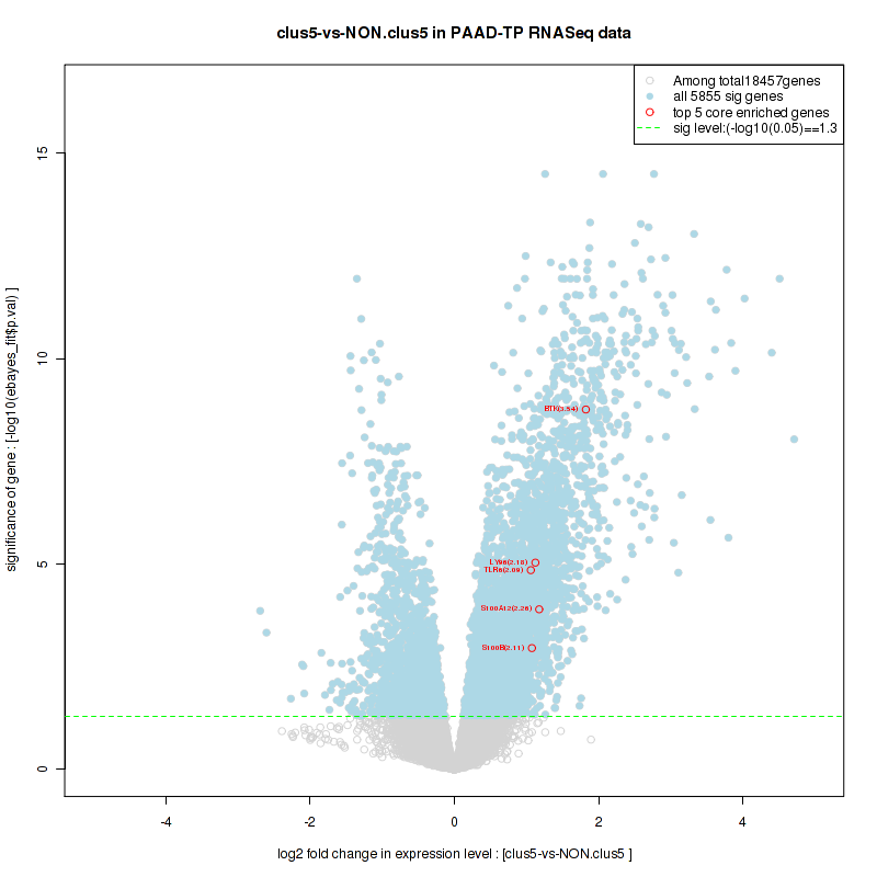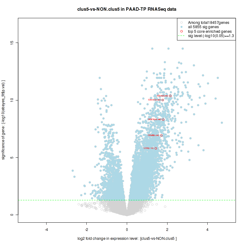 Figure S100. Get High-res Image For the top 5 core enriched genes in the pathway: KEGG APOPTOSIS, this volcano plot shows how much they are up/down-regulated and significant. The significance was calculated by empirical bayesian fit