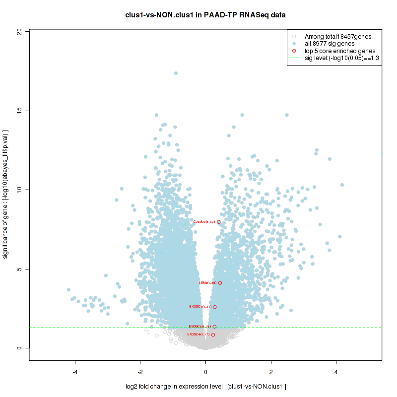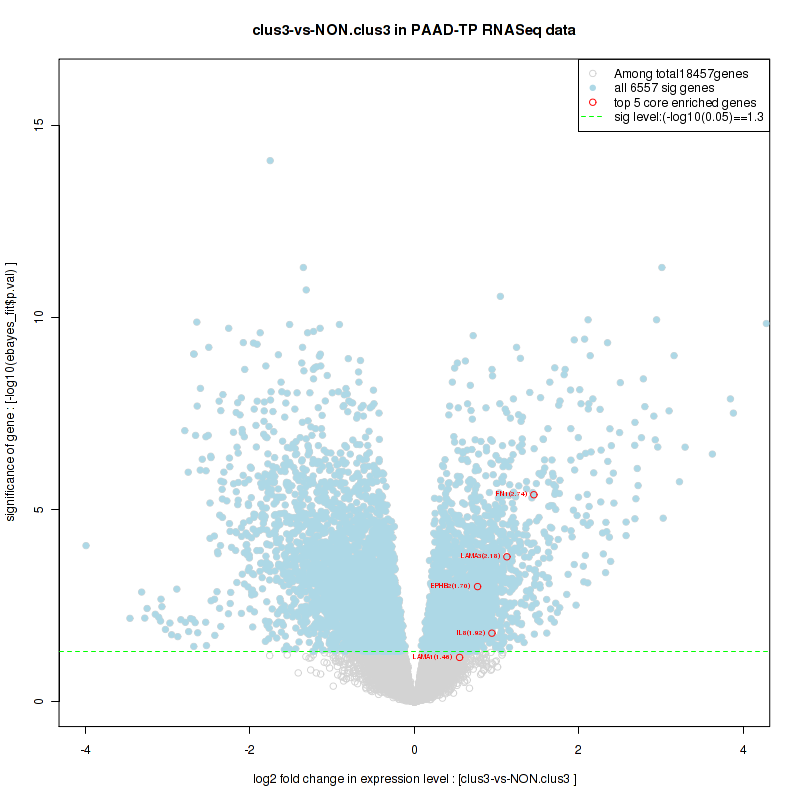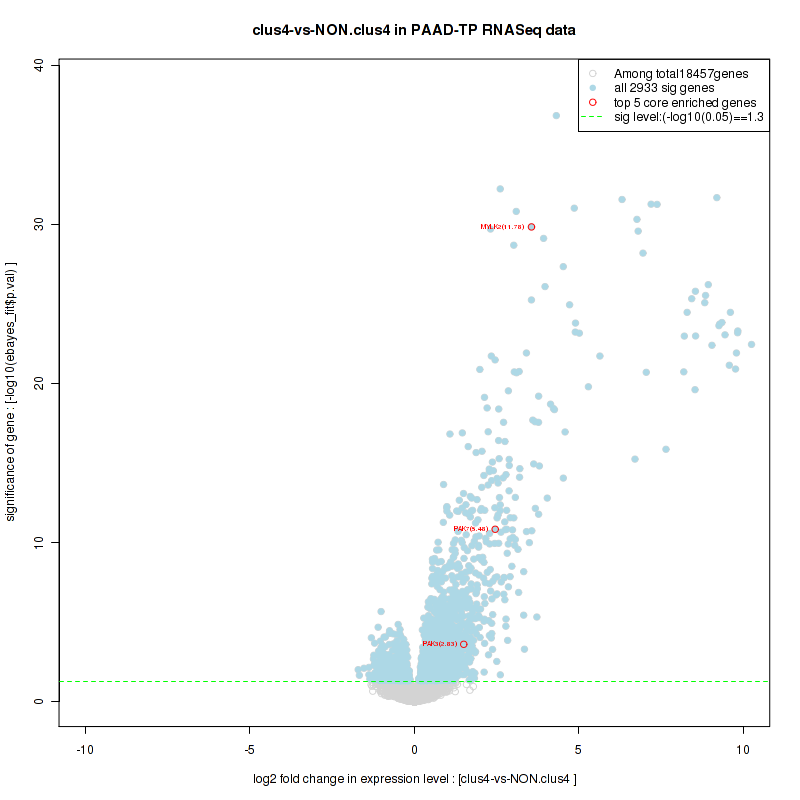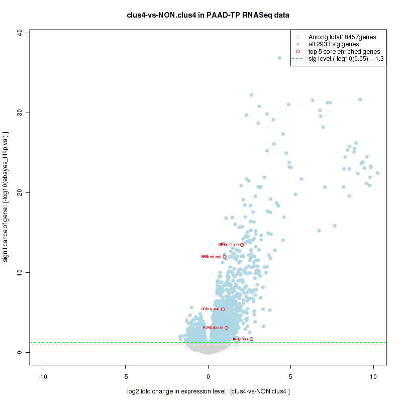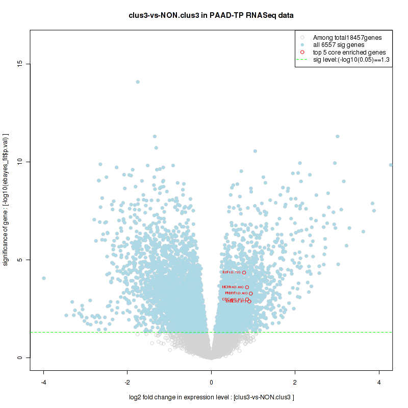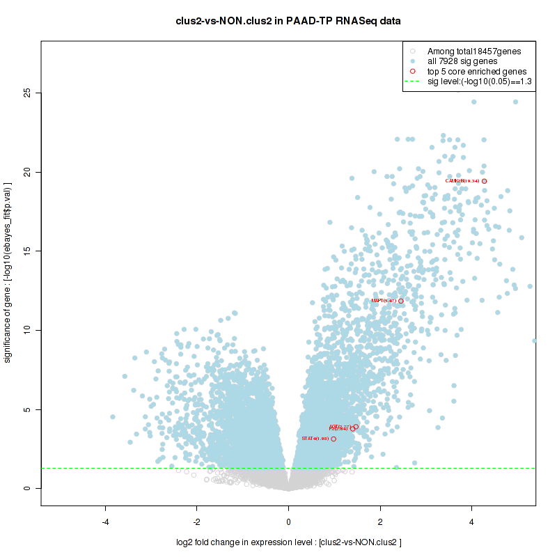 Figure S98. Get High-res Image For the top 5 core enriched genes in the pathway: KEGG MTOR SIGNALING PATHWAY, this volcano plot shows how much they are up/down-regulated and significant. The significance was calculated by empirical bayesian fit