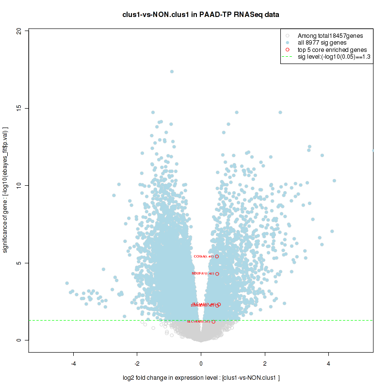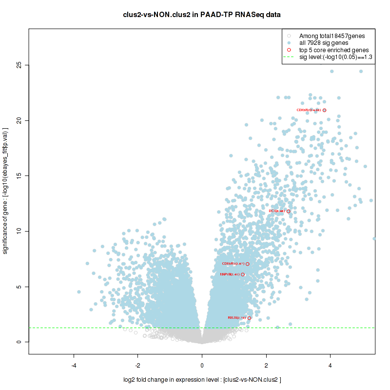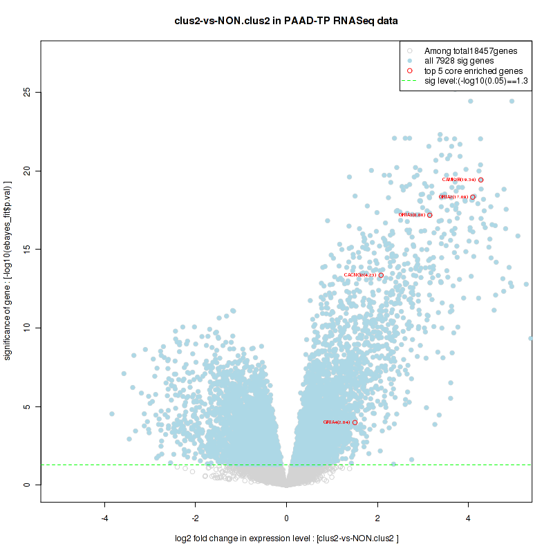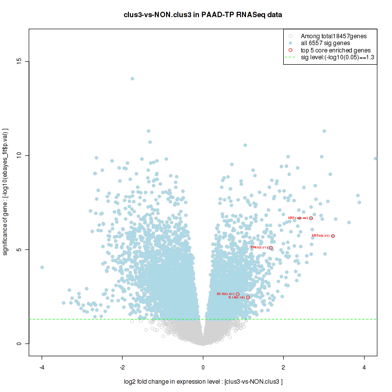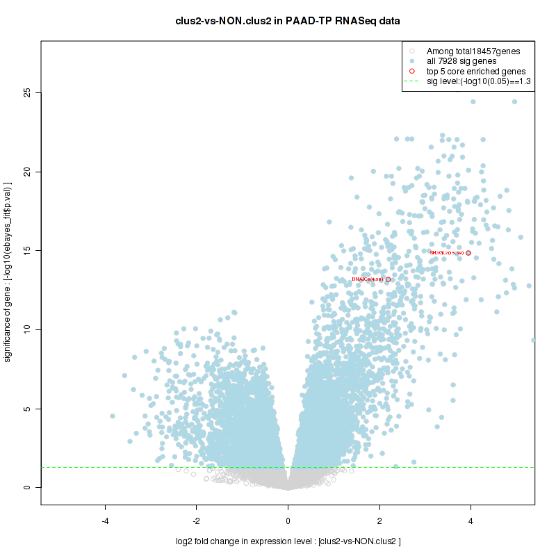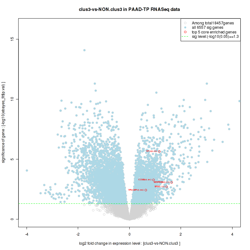 Figure S98. Get High-res Image For the top 5 core enriched genes in the pathway: KEGG MTOR SIGNALING PATHWAY, this volcano plot shows how much they are up/down-regulated and significant. The significance was calculated by empirical bayesian fit