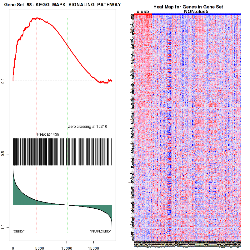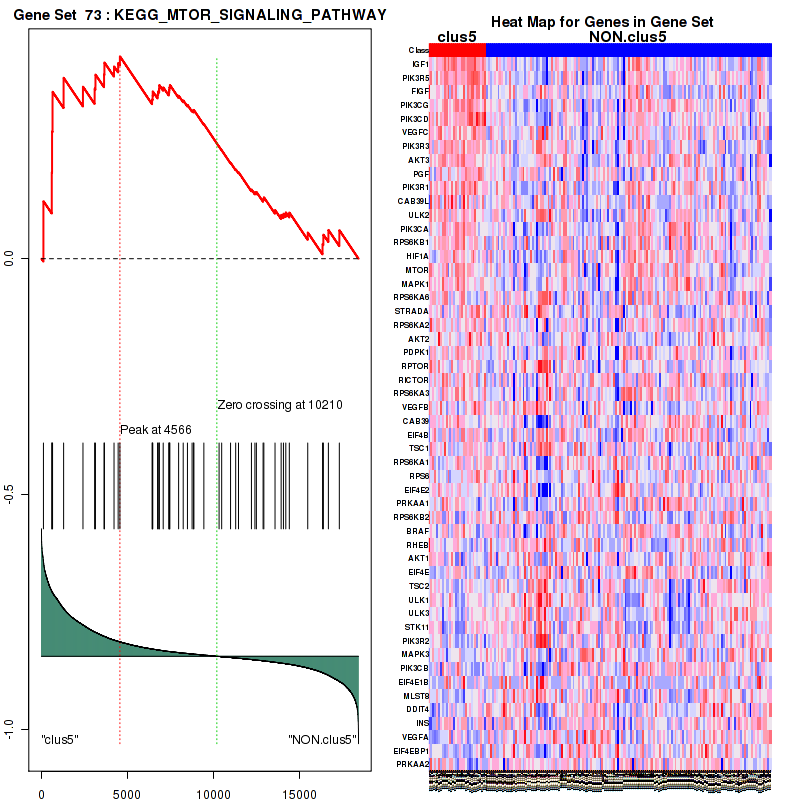 Figure S97. Get High-res Image This plot shows mRNAseq_cNMF expression data heatmap (on the left) a RunningEnrichmentScore(RES) plot (on the top right) and a Signal2Noise(S2N) plot (on the bottom right) of genes in the pathway: KEGG MTOR SIGNALING PATHWAY.