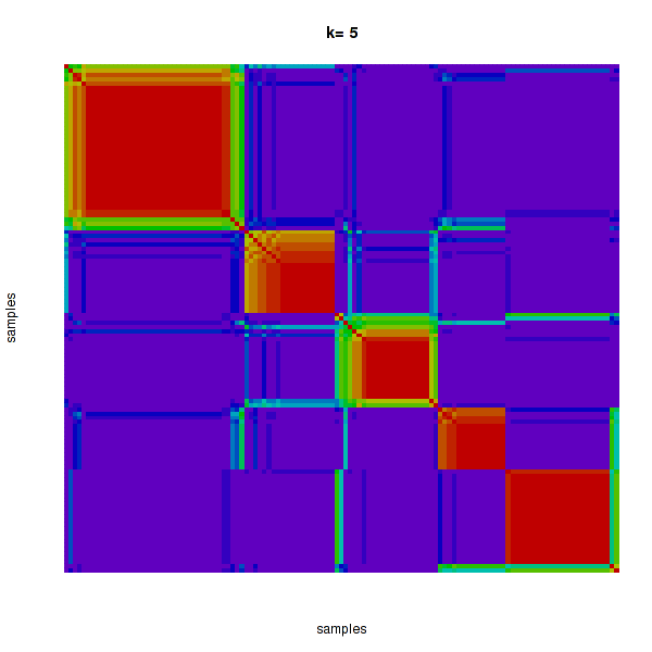 Figure 4. Get High-res Image The consensus matrix after clustering shows 5 clusters with limited overlap between clusters.