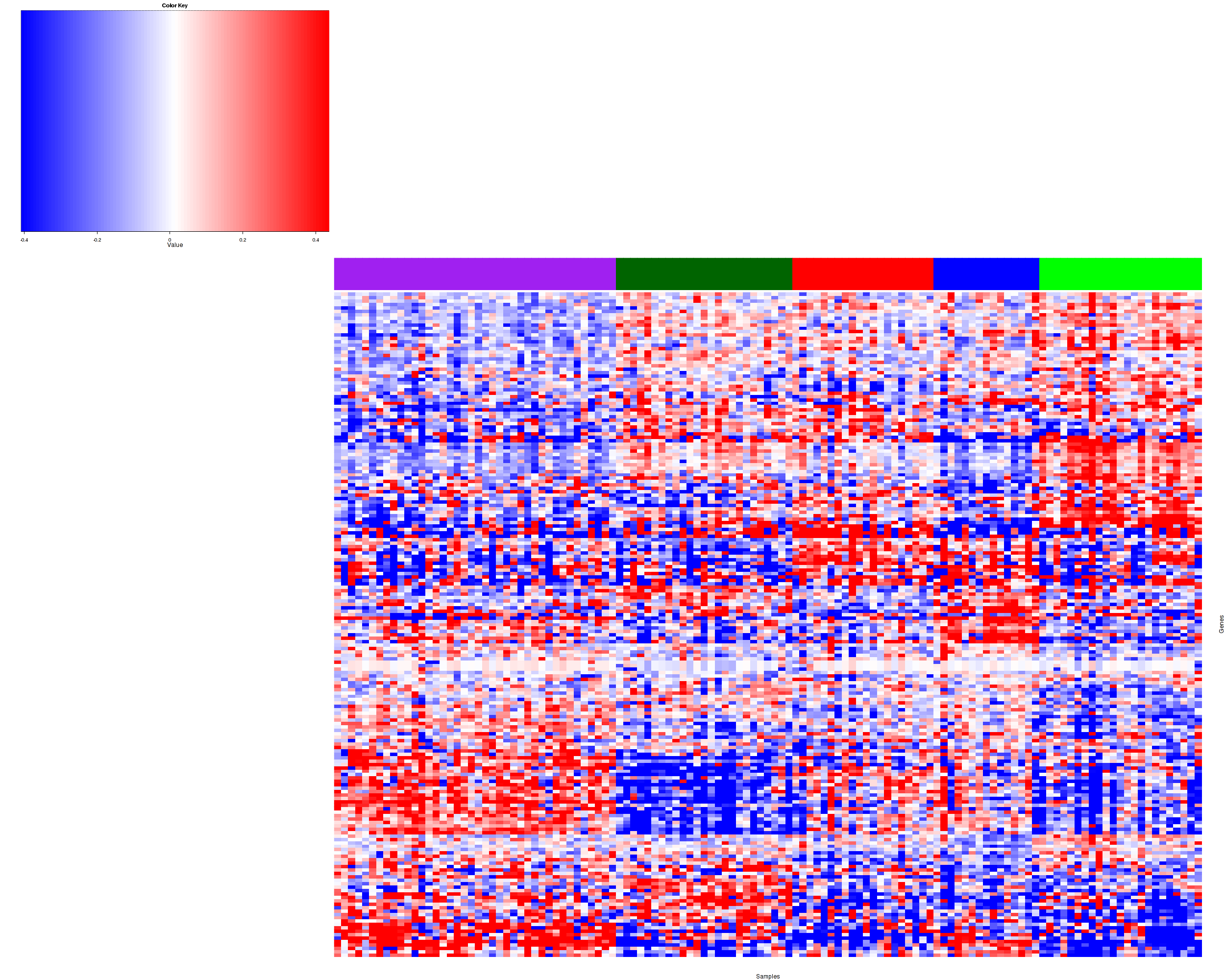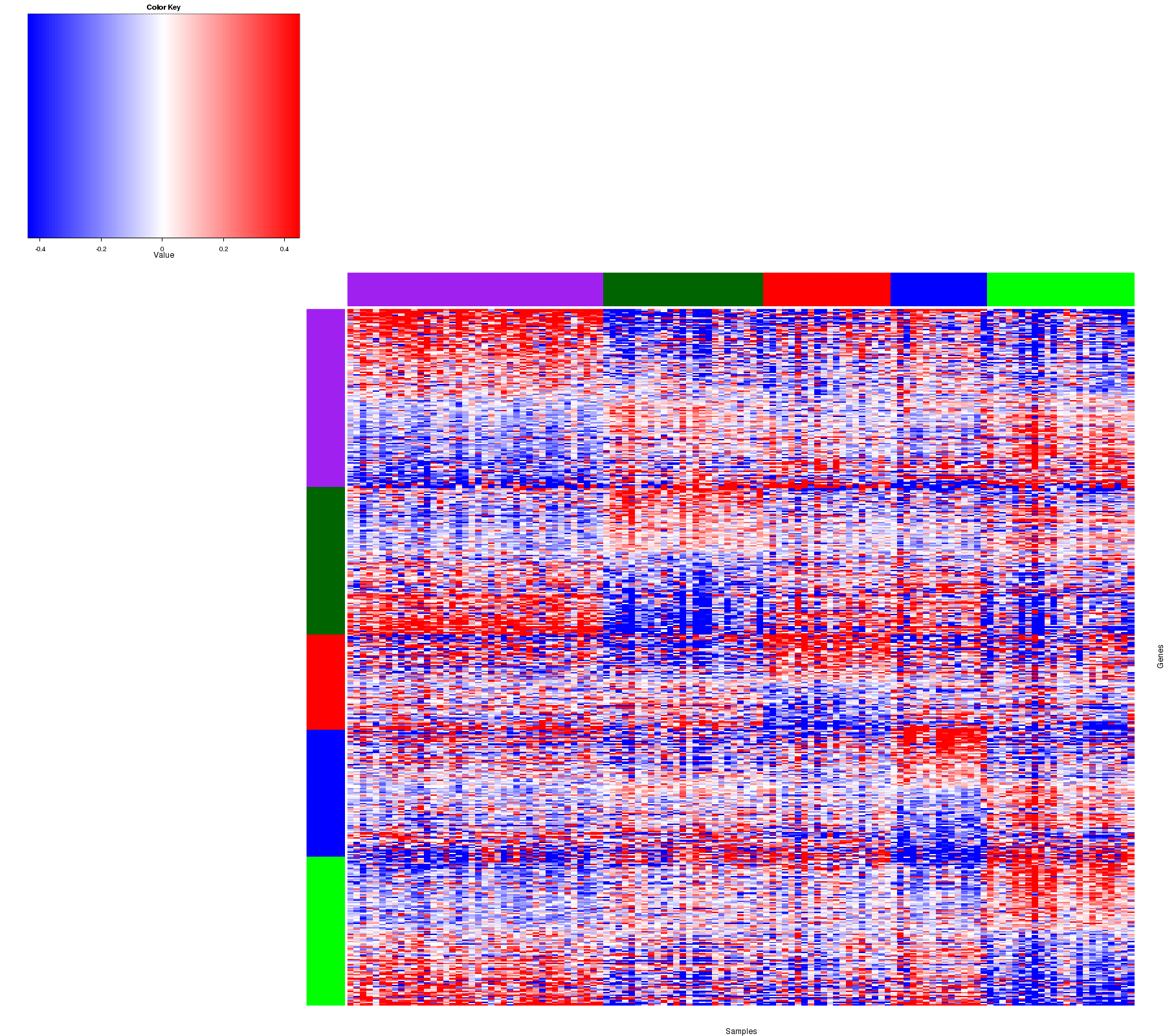 Figure 1. Get High-res Image Samples were separated into 5 clusters. Shown are 123 samples and 505 marker proteins. The color bar of the row indicates the marker proteins for the corresponding cluster.