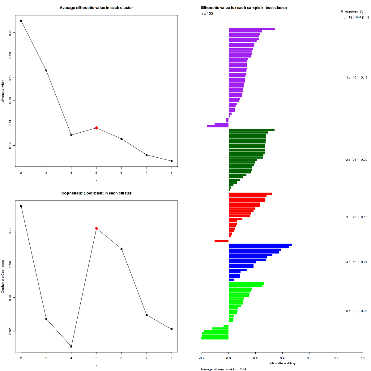 Figure 3. Get High-res Image The silhouette width was calculated for each sample and each value of k. The left upper panel shows the average silhouette width across all samples for each tested k (left upper panel). The left lower panel shows the Cophenetic Correlation Coefficients for each tested k. The right panel shows assignments of clusters to samples and the silhouette width of each sample for the most robust clustering.
