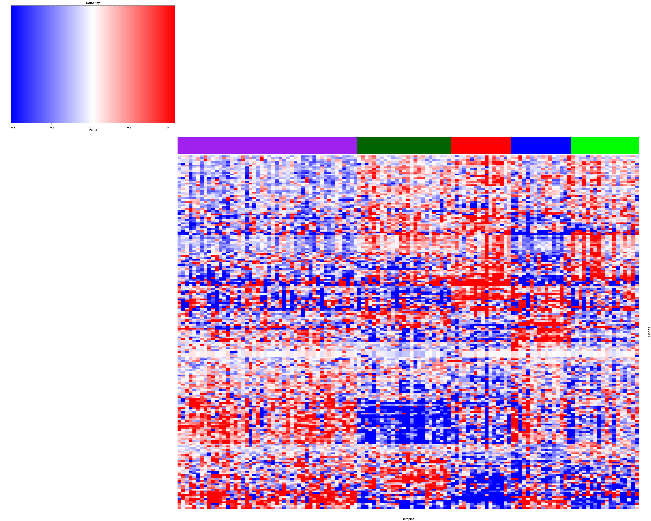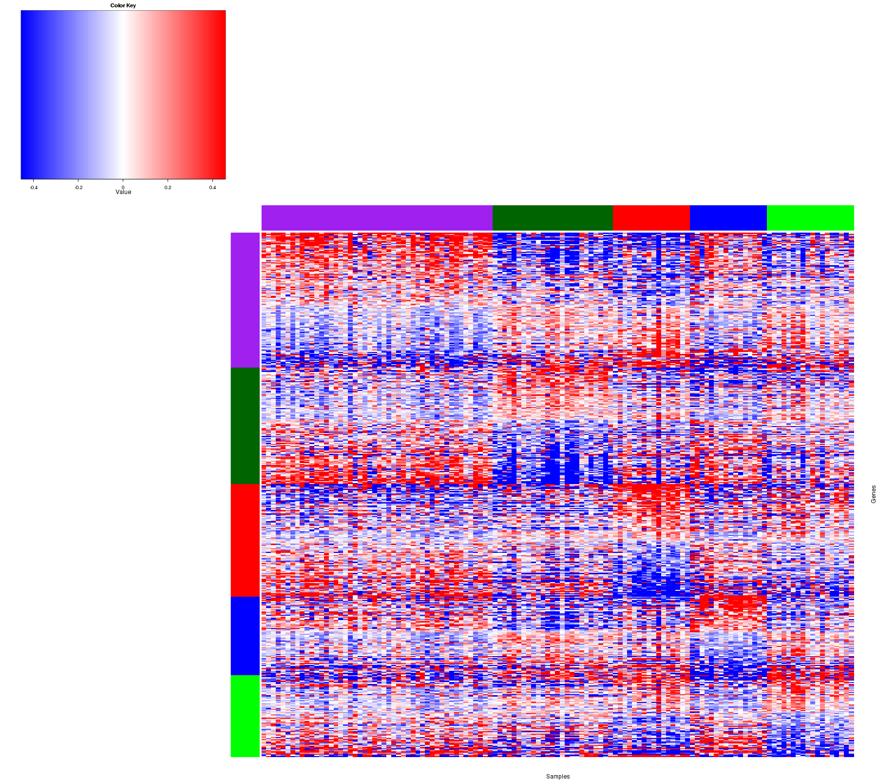 Figure 1. Get High-res Image Samples were separated into 5 clusters. Shown are 123 samples and 467 marker proteins. The color bar of the row indicates the marker proteins for the corresponding cluster.
