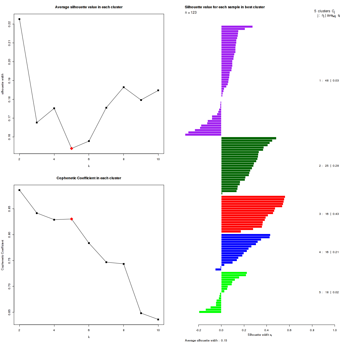 Figure 3. Get High-res Image The silhouette width was calculated for each sample and each value of k. The left upper panel shows the average silhouette width across all samples for each tested k (left upper panel). The left lower panel shows the Cophenetic Correlation Coefficients for each tested k. The right panel shows assignments of clusters to samples and the k silhouette width of each sample for the most robust clustering.