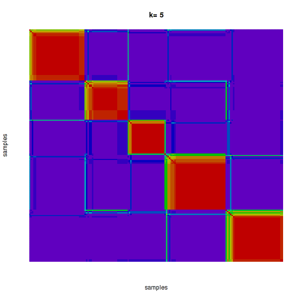 Figure 4. Get High-res Image The consensus matrix after clustering shows 5 clusters with limited overlap between clusters.