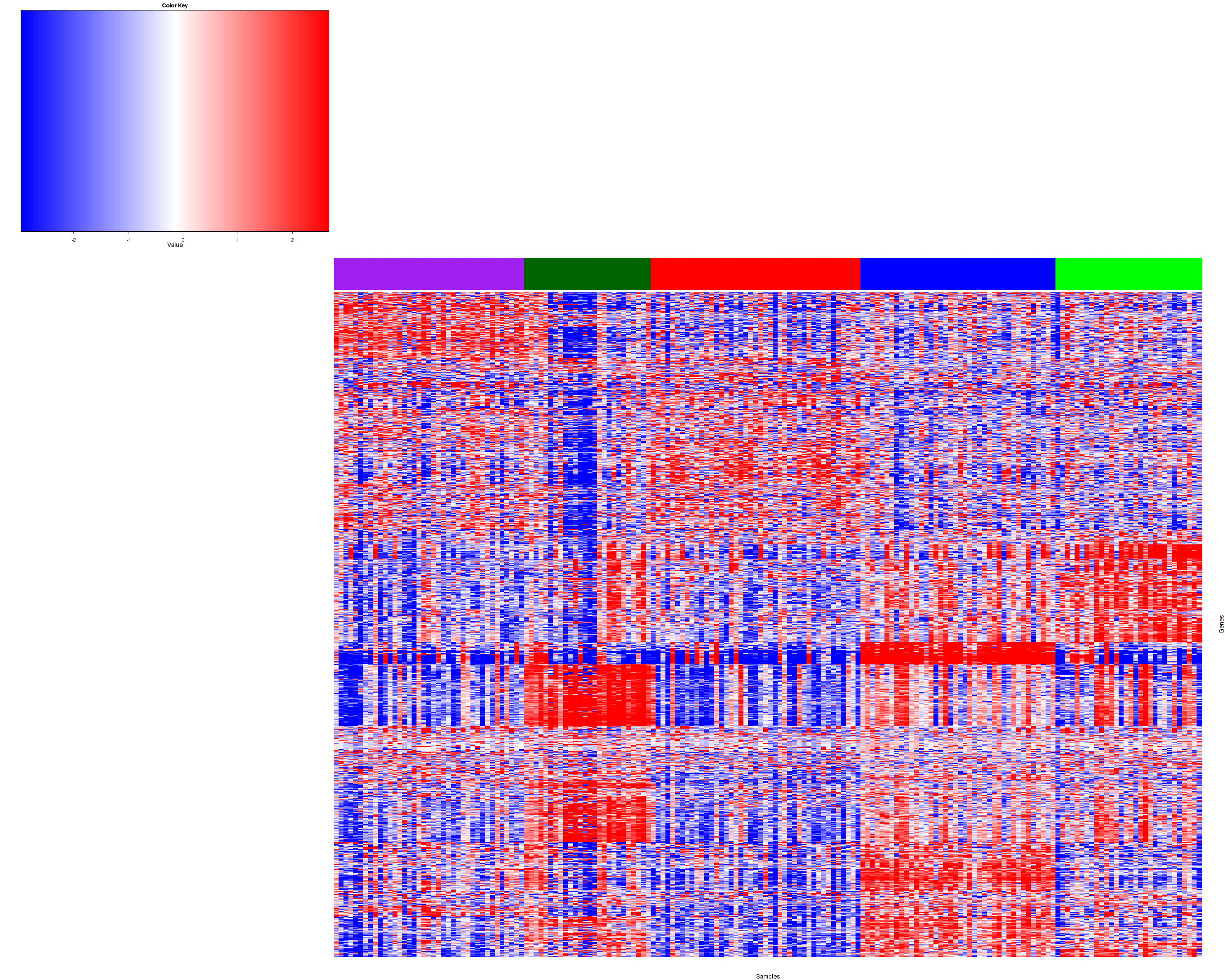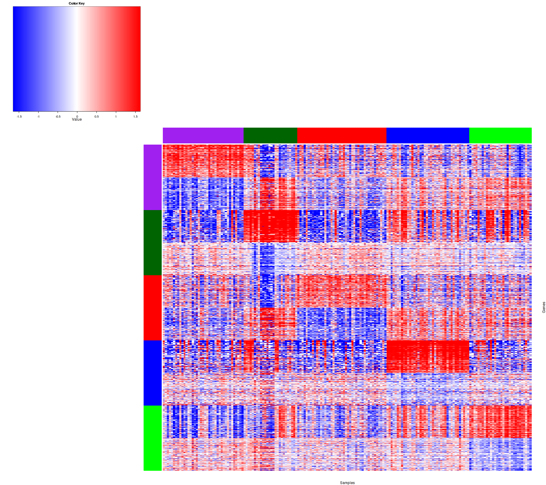 Figure 1. Get High-res Image Samples were separated into 5 clusters. Shown are 178 samples and 1500 marker genes. The color bar of the row indicates the marker genes for the corresponding cluster.
