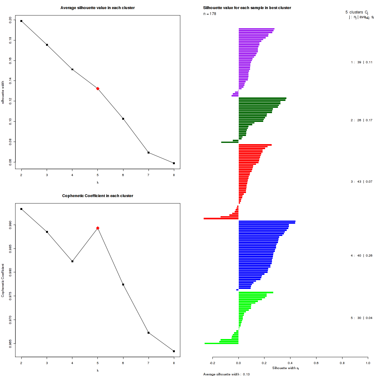 The most robust consensus NMF clustering of 178 samples using the 1500 most variable genes was identified for k = 5 clusters. We computed the clustering for k = 2 to k = 10 and uused the cophenetic correlation coefficient and the average silhouette width calculation to determine the robust clusters.