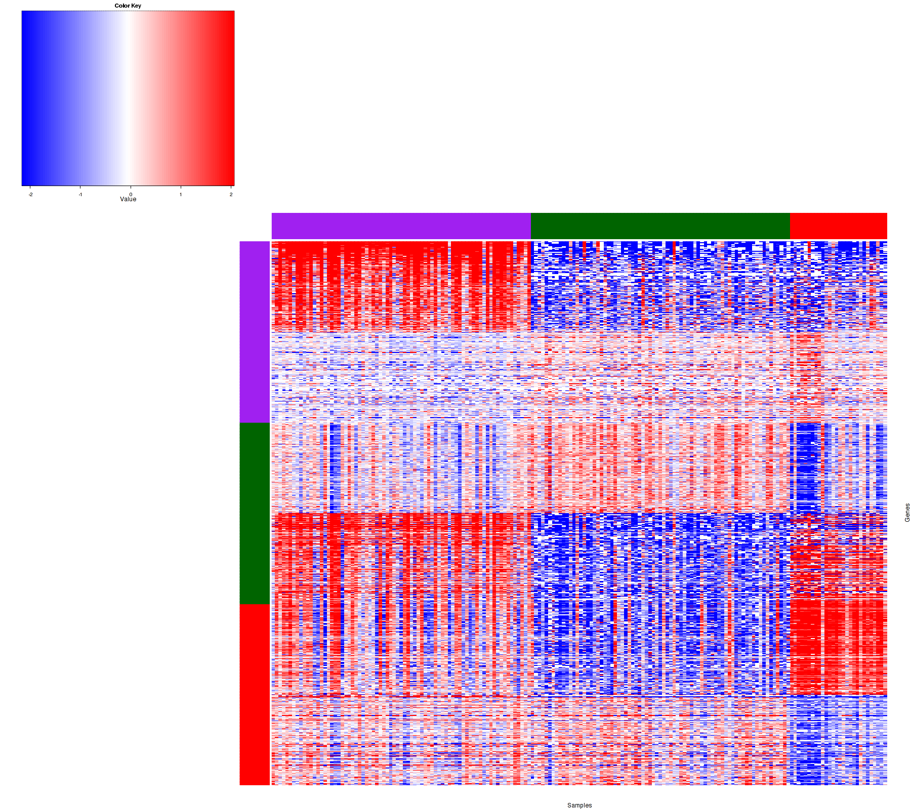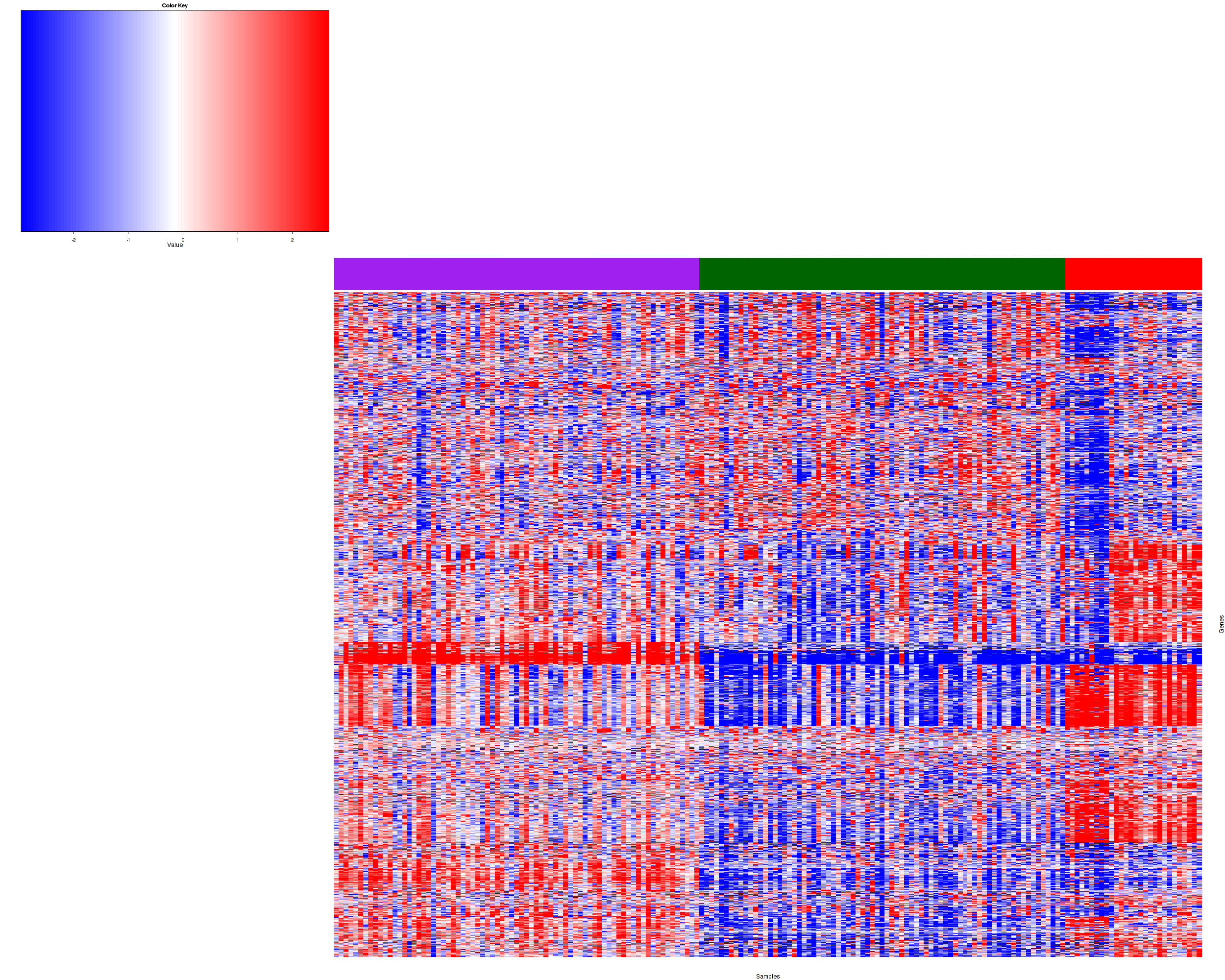 Figure 1. Get High-res Image Samples were separated into 3 clusters. Shown are 178 samples and 900 marker genes. The color bar of the row indicates the marker genes for the corresponding cluster.