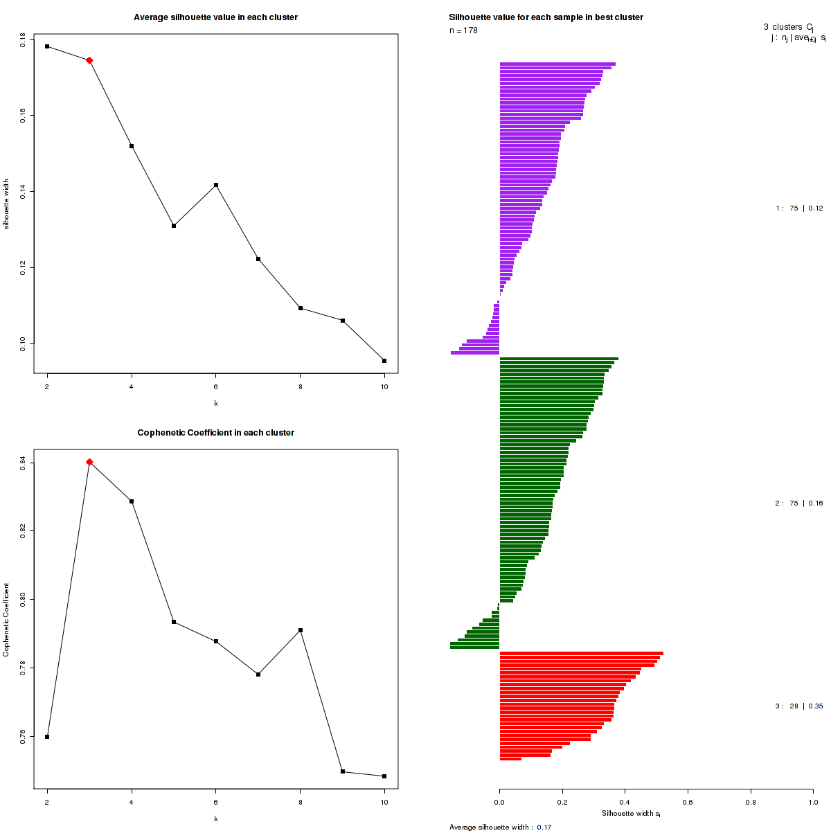 Figure 3. Get High-res Image The silhouette width was calculated for each sample and each value of k. The left upper panel shows the average silhouette width across all samples for each tested k (left upper panel). The left lower panel shows the Cophenetic Correlation Coefficients for each tested k. The right panel shows assignments of clusters to samples and the k silhouette width of each sample for the most robust clustering.