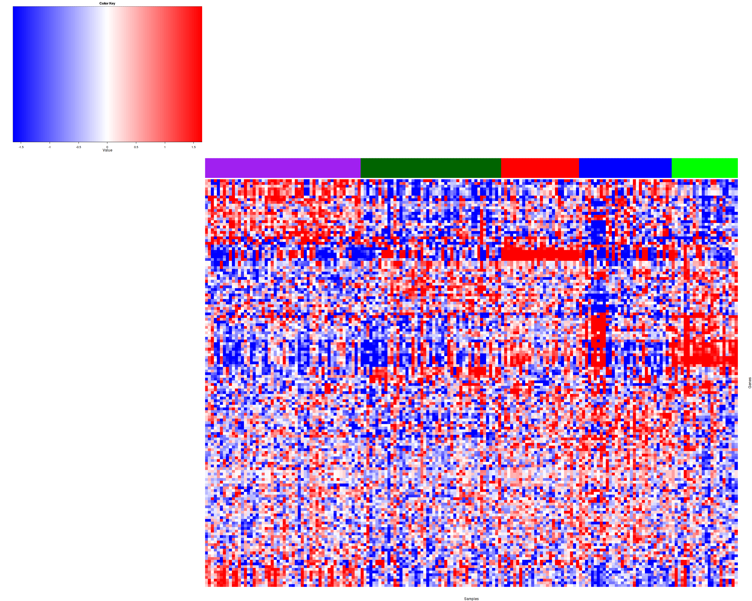 Figure 1. Get High-res Image Samples were separated into 5 clusters. Shown are 178 samples and 614 marker miRs. The color bar of the row indicates the marker miRs for the corresponding cluster.