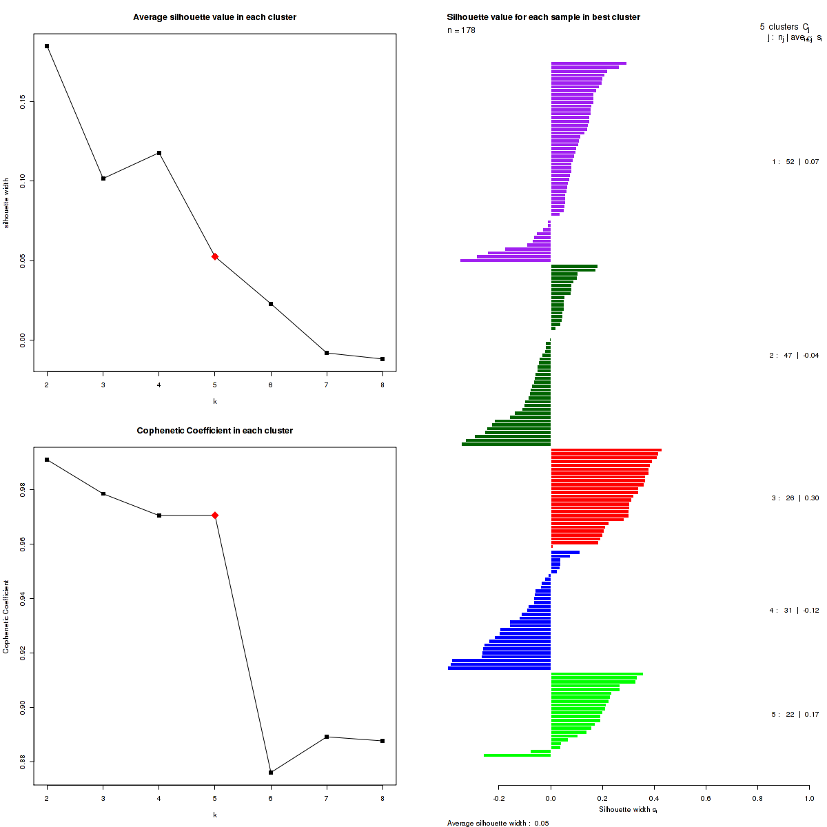 Figure 3. Get High-res Image The silhouette width was calculated for each sample and each value of k. The left upper panel shows the average silhouette width across all samples for each tested k (left upper panel). The left lower panel shows the Cophenetic Correlation Coefficients for each tested k. The right panel shows assignments of clusters to samples and the silhouette width of each sample for the most robust clustering.